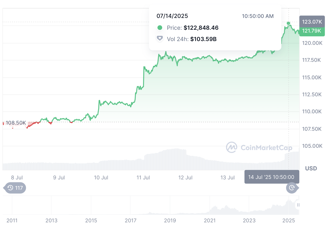 Ціна на біткоїн пробила нову висоту — його вартість зросла до понад $120 тисяч за одиницю. Різні джерела вказують максимальну висоту: від $121 249,9 до понад $123 000. Це історичний рекорд, ніколи раніше біткоїн не вартував так багато. Загальна капіталізація монети складає $2,4 трлн, а загальна оцінка ринку виросла до $3,8 трлн. Частково також почали зростати інші монети.