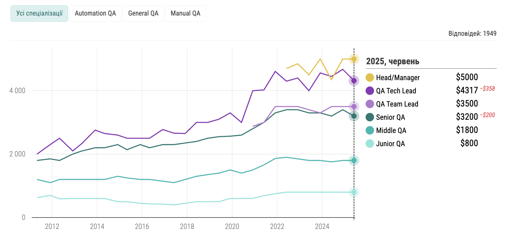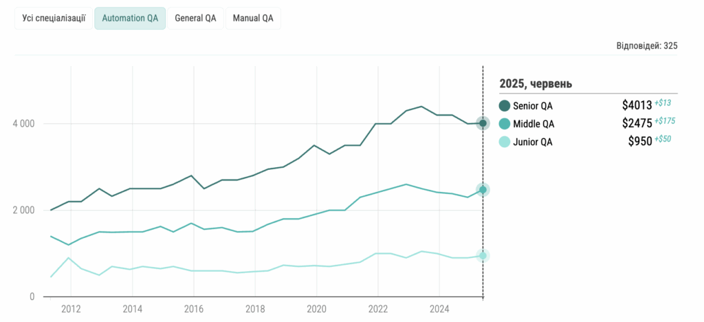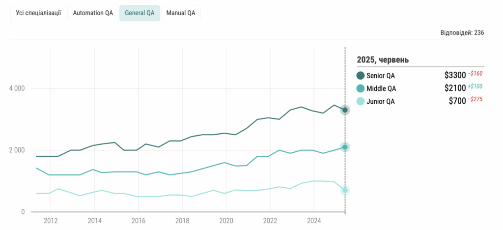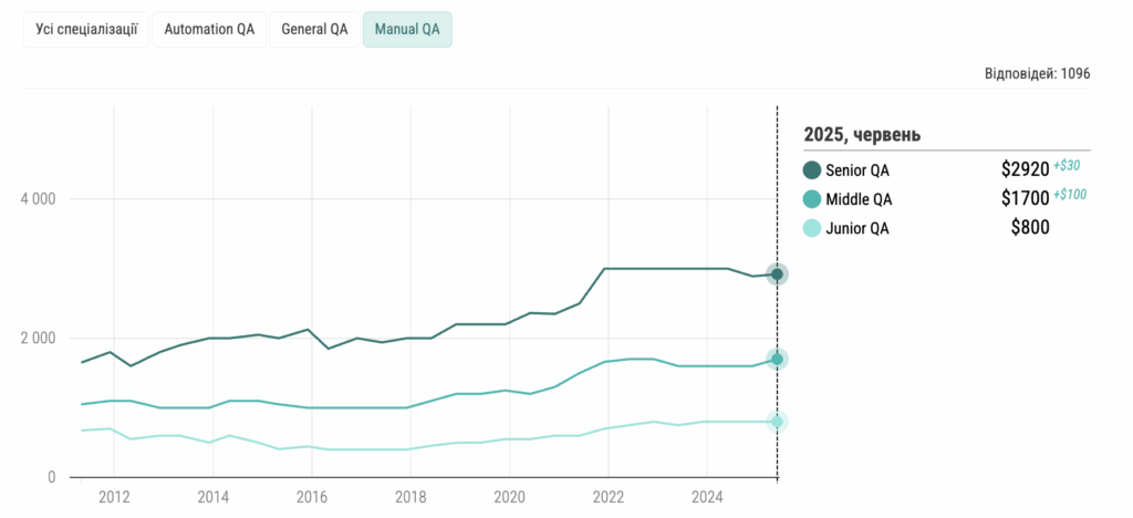 - Зарплати досвідчених General QA дещо знизилися після різкого зростання взимку 2024 року. Проте вони вищі, ніж рік тому.