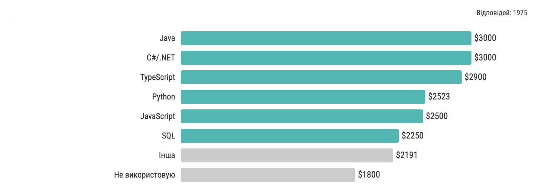 - Медіанні зарплати тих, хто обирає C# / .NET, Java і TypeScript, традиційно вищі, ніж у тих, хто найчастіше використовує Python чи JavaScript.