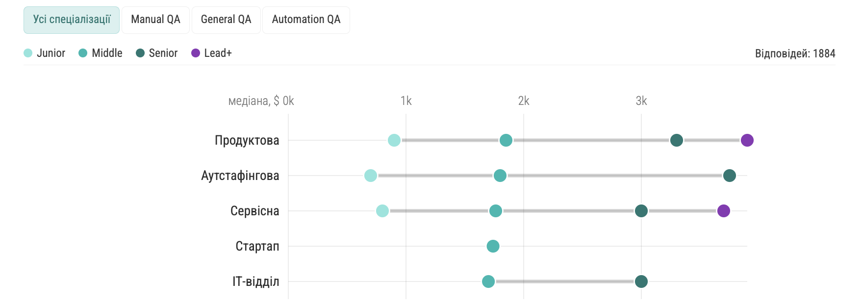 - Продуктові компанії пропонують дещо вищі зарплати Junior і Middle Manual QA. За останні пів року зарплати Junior Manual QA в продуктових компаніях зросли на $100, а Middle Manual QA на $140. Медіанна зарплата Senior Manual QA найвища в аутстафінгових компаніях, а лідів — у сервісних.
