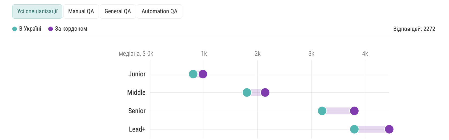 - Українські QA, які зараз живуть за кордоном, мають дещо вищі зарплати, ніж їхні колеги в Україні. В середньому різниця становить 10% у Manual QA та приблизно 20% у AQA та General QA.