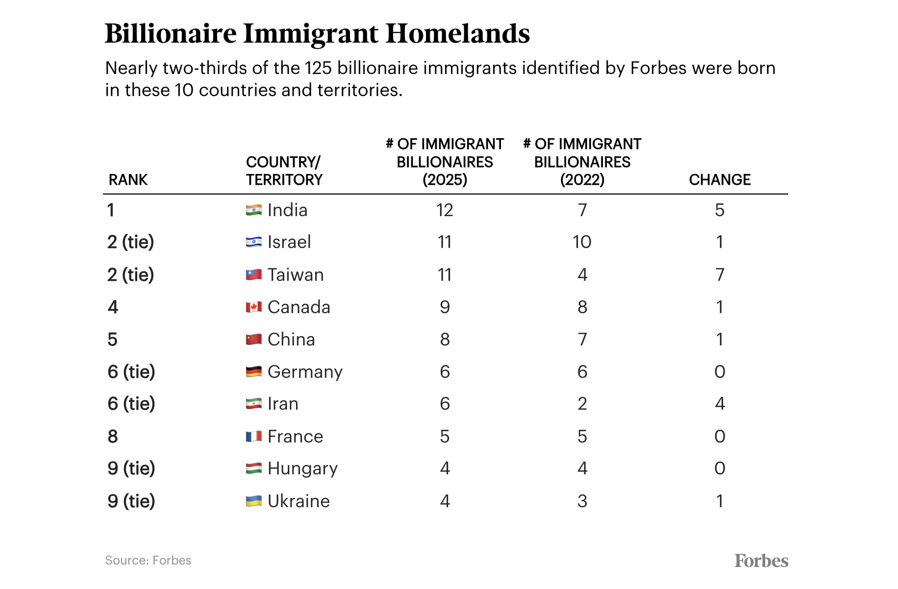 До нового рейтингу Forbes увійшли іммігранти, які або є громадянами США, або нині проживають у Сполучених Штатах і станом на 7 липня 2025 року мають статки понад $1 млрд. На першому місці за країною походження – Індія, з якої емігрували 12 нинішніх американських мільярдерів.