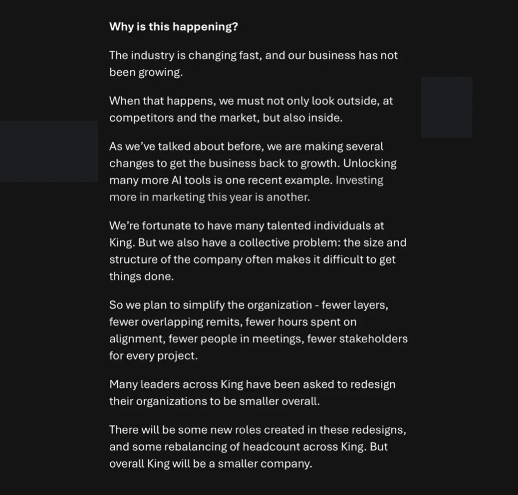 - King повідомила персоналу, що нову організаційну структуру представлять у вересні після перемовин із профспілками. Наразі багато співробітників перебувають у підвішеному стані на все літо. Останнє внутрішнє опитування показало рекордно низький моральний дух.