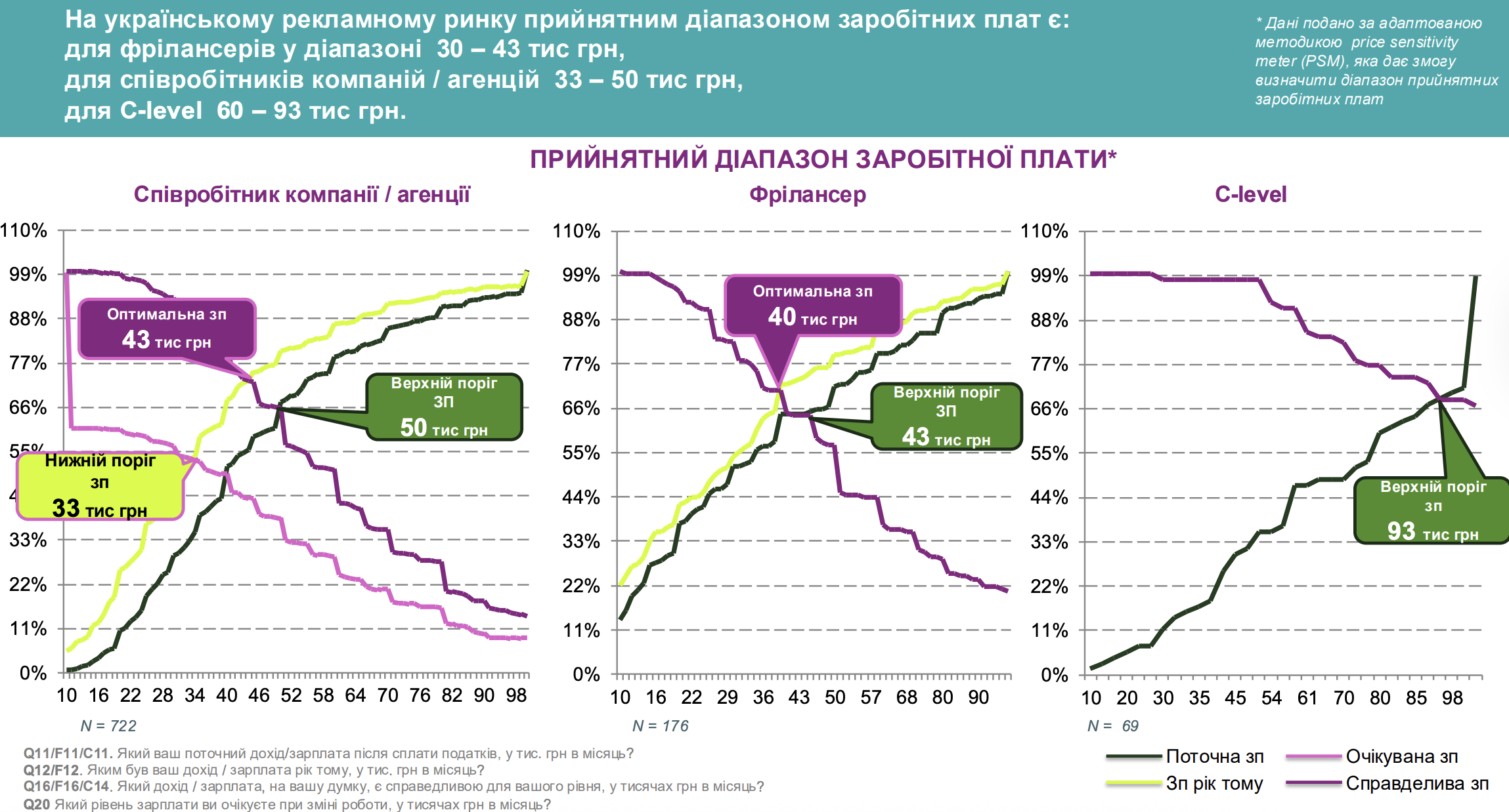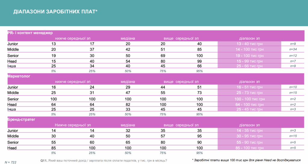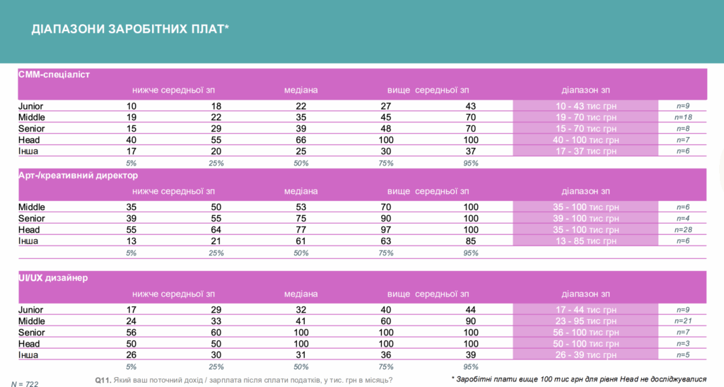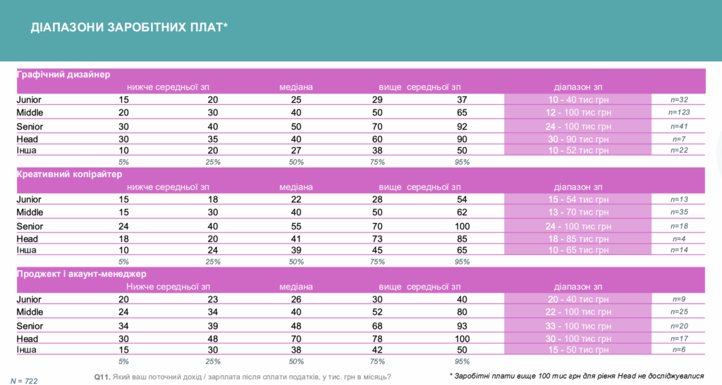 Спостерігається значний розрив в заробітних платах агенцій/компаній, але прийнятний діапазон на українському рекламному ринку такий: