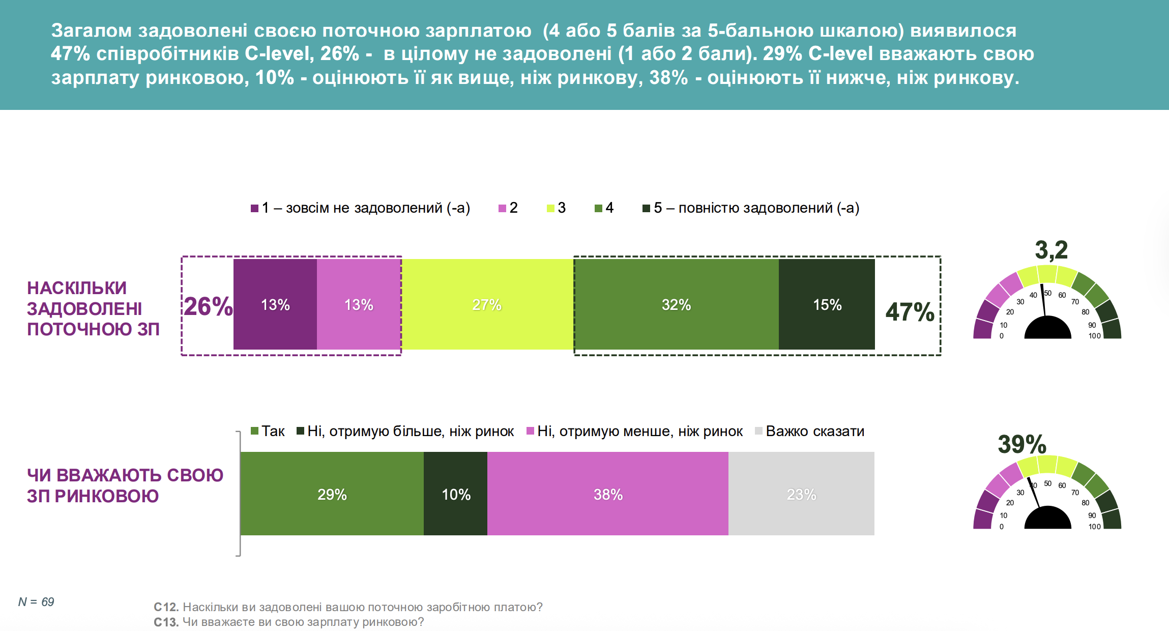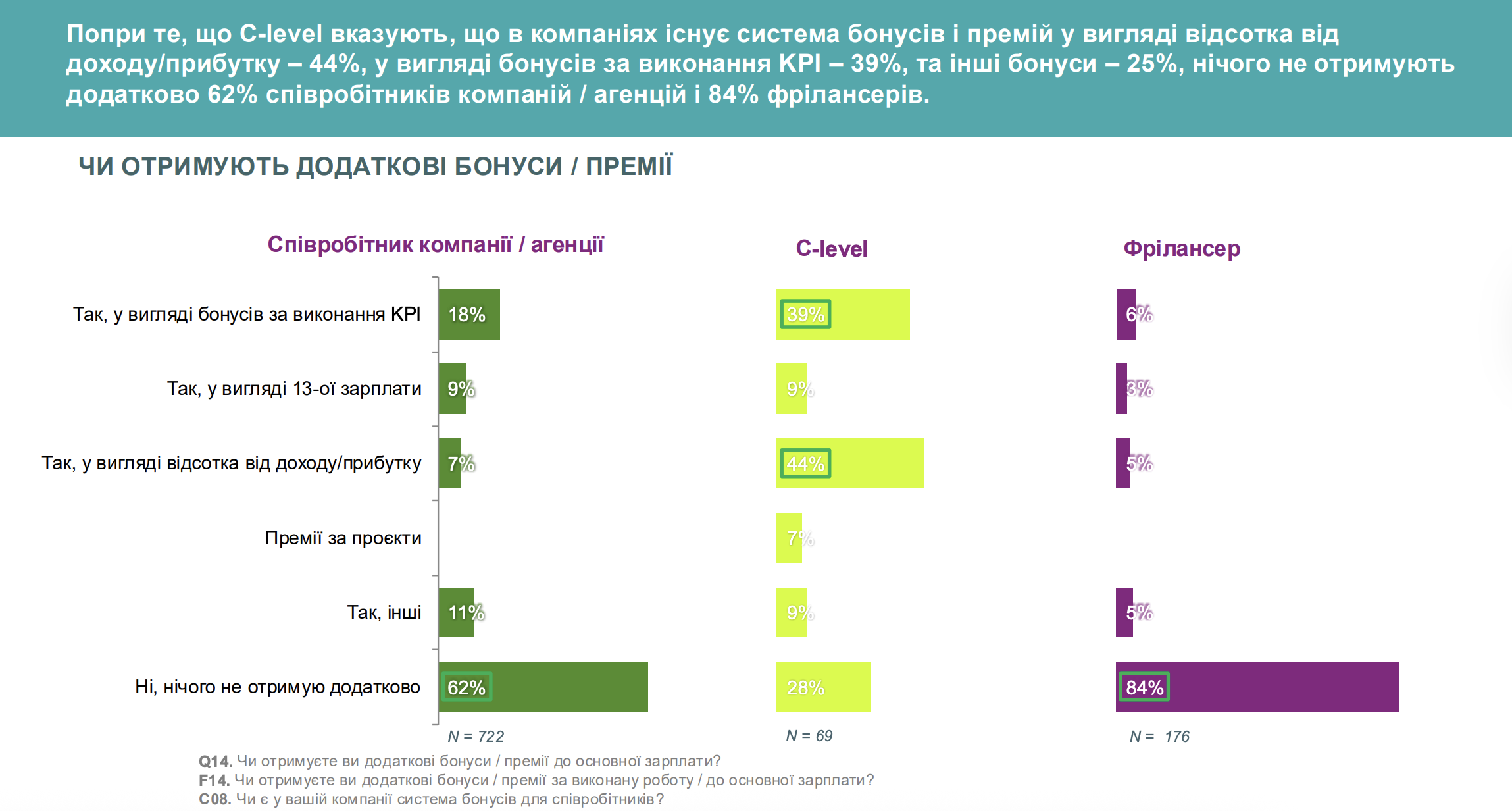 - Попри те, що C-level вказують, що в їхніх компаніях існує система бонусів і премій у вигляді відсотка від доходу/прибутку (44%), у вигляді бонусів за виконання KPI (39%) та інші бонуси (25%), нічого крім зарплати не отримує 62% співробітників і 84% фрилансерів.