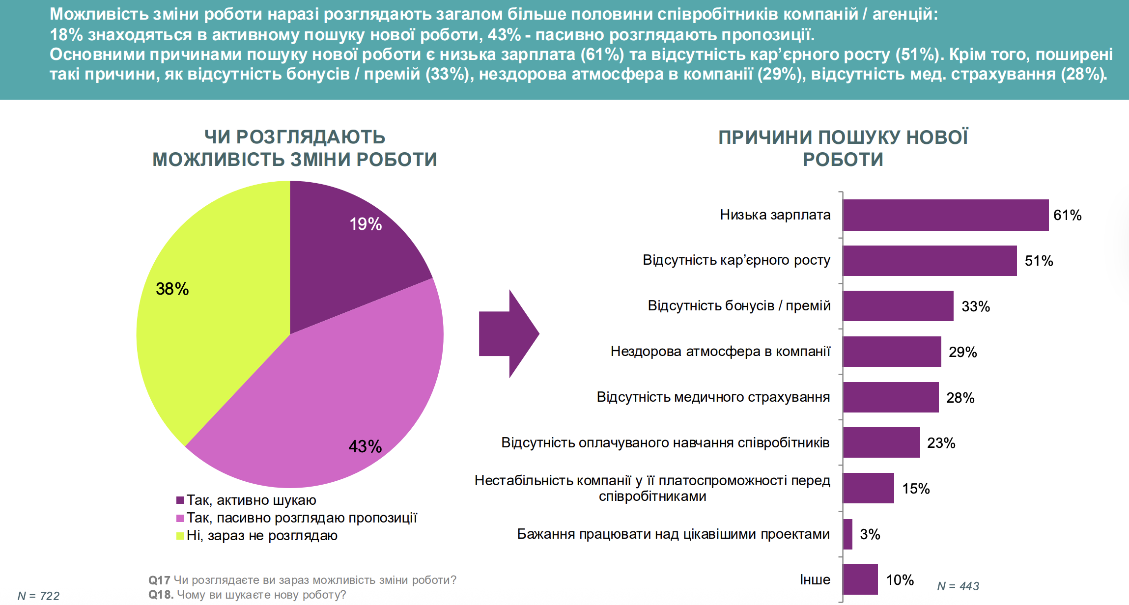 Основними причинами пошуку нової роботи є низька зарплата (61%) та відсутність кар’єрного росту (51%). Серед інших причин є відсутність бонусів / премій (33%), нездорова атмосфера в компанії (29%), відсутність медичного страхування (28%).