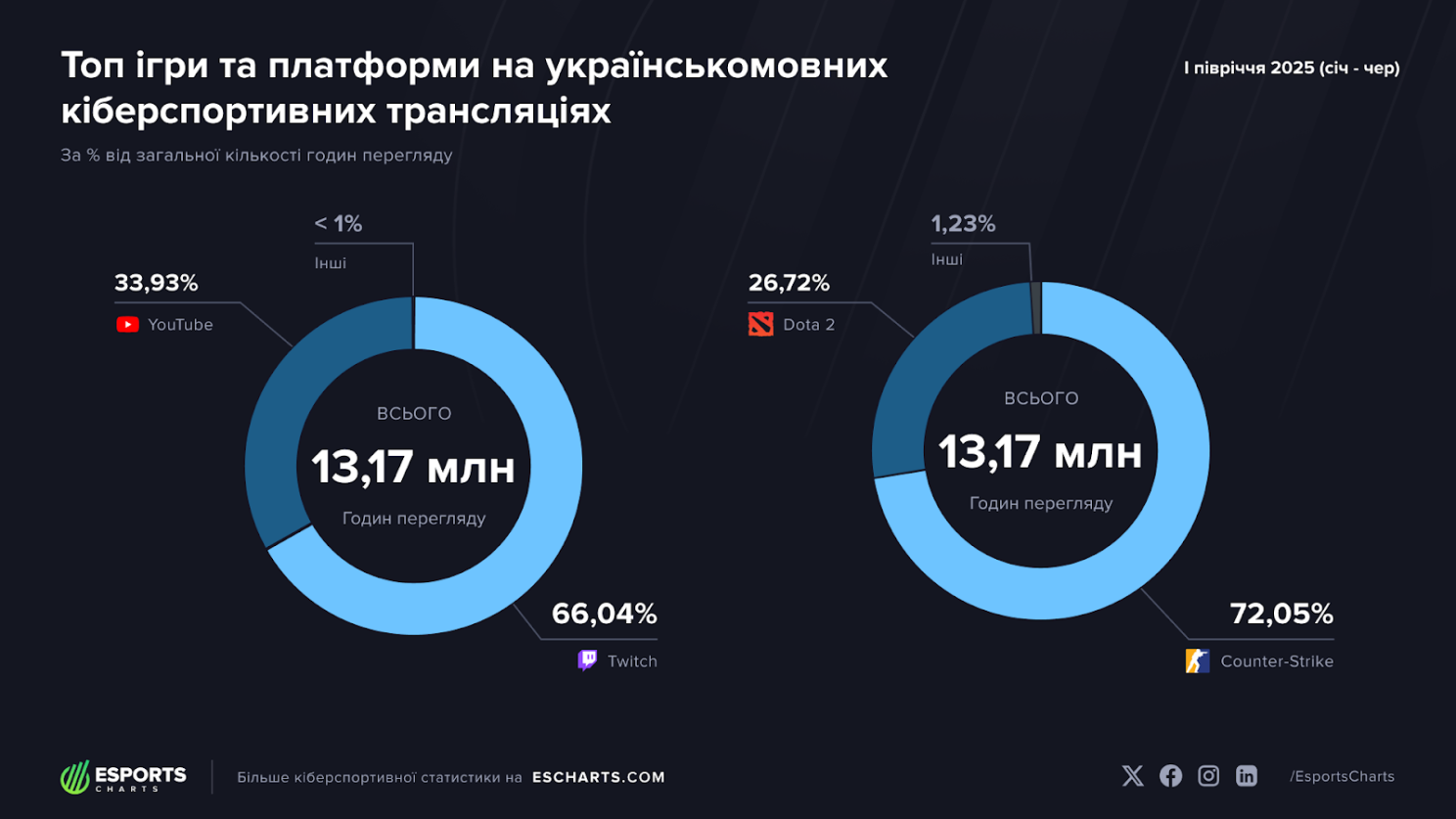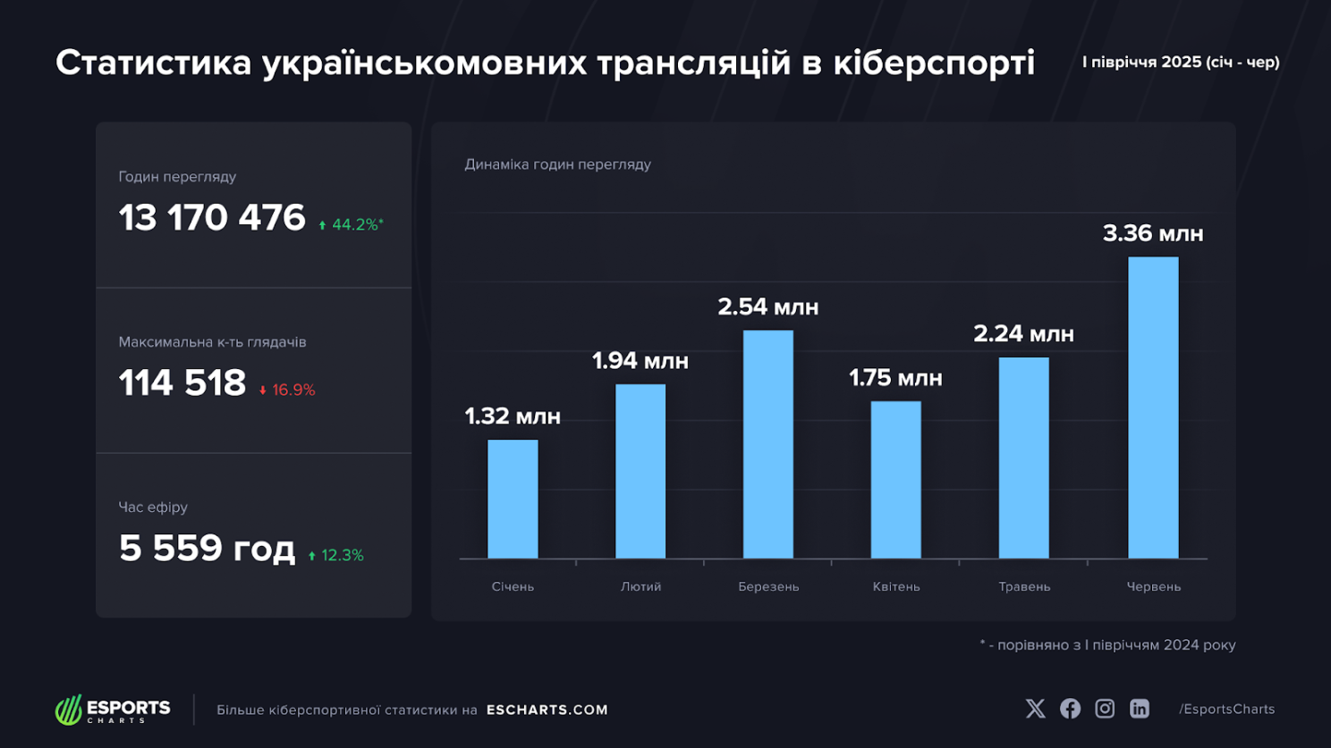 - За першу половину 2025 року українськомовні трансляції кіберспорту сумарно згенерували понад 13,1 млн годин перегляду — це на 44,2% більше ніж за перше півріччя 2024-го. Така динаміка пов’язана з загальною кількістю турнірів, що зросла, а також з результатами Natus Vincere в Counter-Strike і Dota 2.