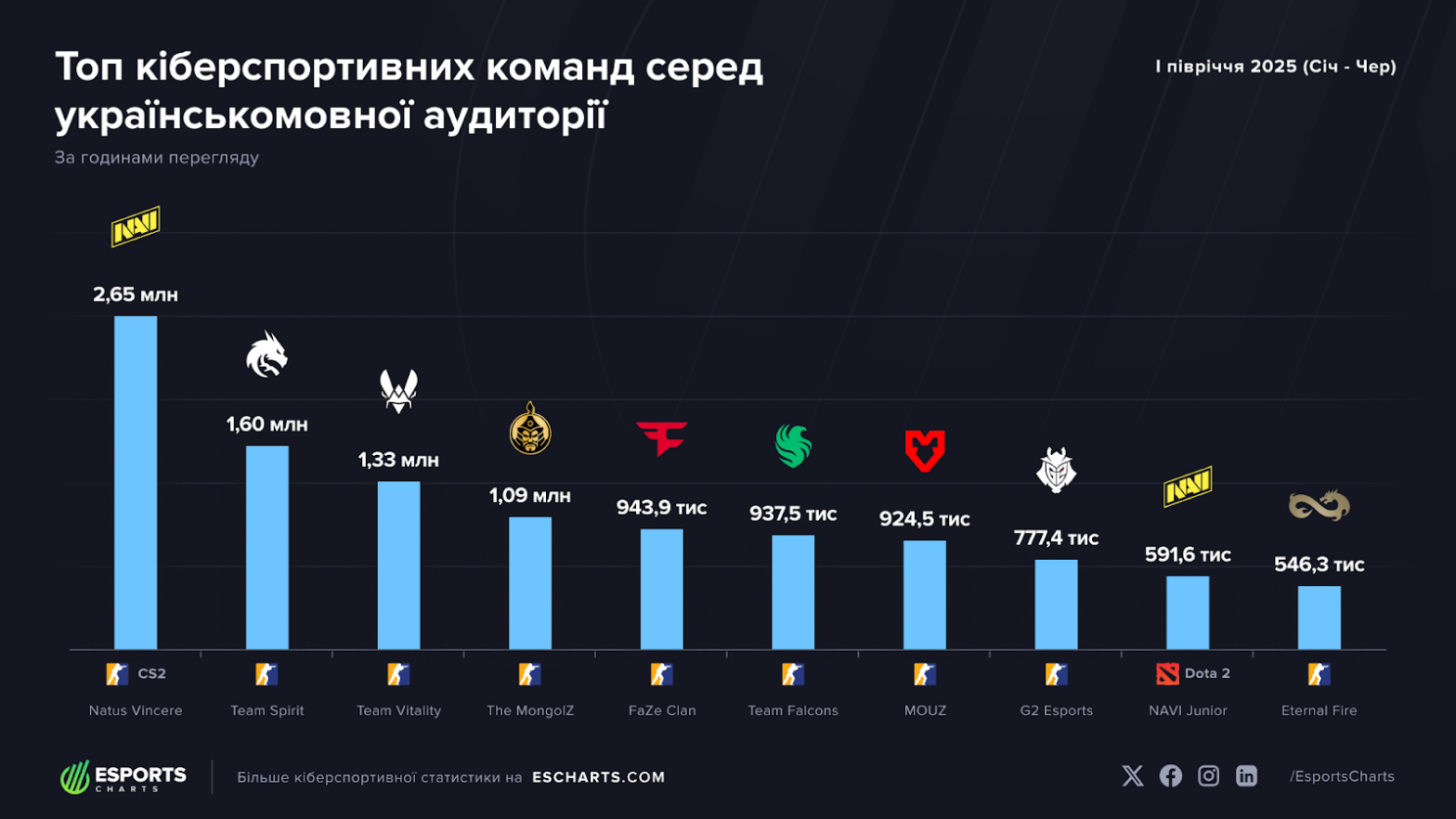 - Найпопулярнішою командою на українськомовних трансляціях кіберспорту став склад Natus Vincere по Counter-Strike. Матчі команди сумарно набрали понад 2,6 млн годин перегляду за перші шість місяців 2025 року. Це – 20% усіх українськомовних трансляцій кіберспорту за вказаний період.