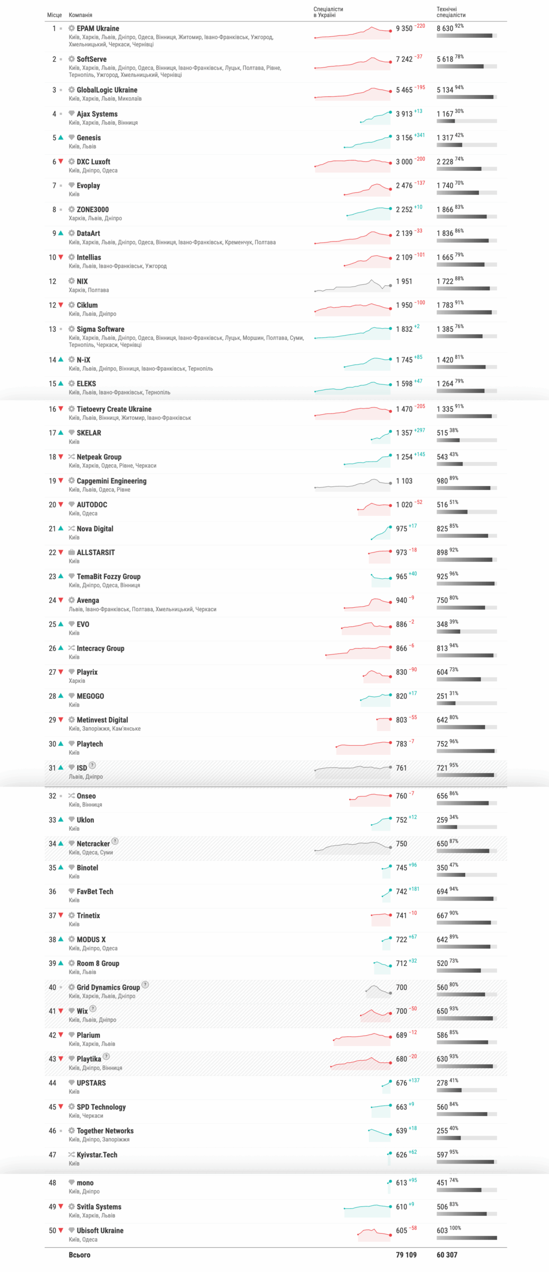 - Вибули Innovecs (600 фахівців в Україні), Creatio (593), Viseven (562). Також не в рейтингу SQUAD, яку спіткали скорочення (нині 591 фахівець, мінус 224 за пів року).