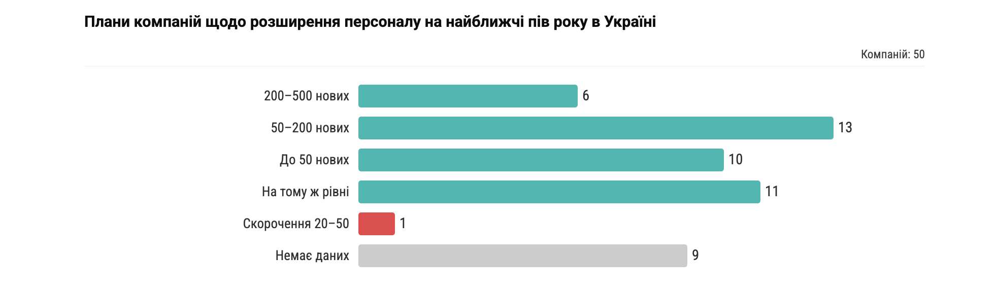 - У половини з 50 компаній кількість фахівців майже не змінилася за пів року. Дев’ять компаній активно зростали (команда збільшилася на +10%) — усі з них продуктові або гібридні.