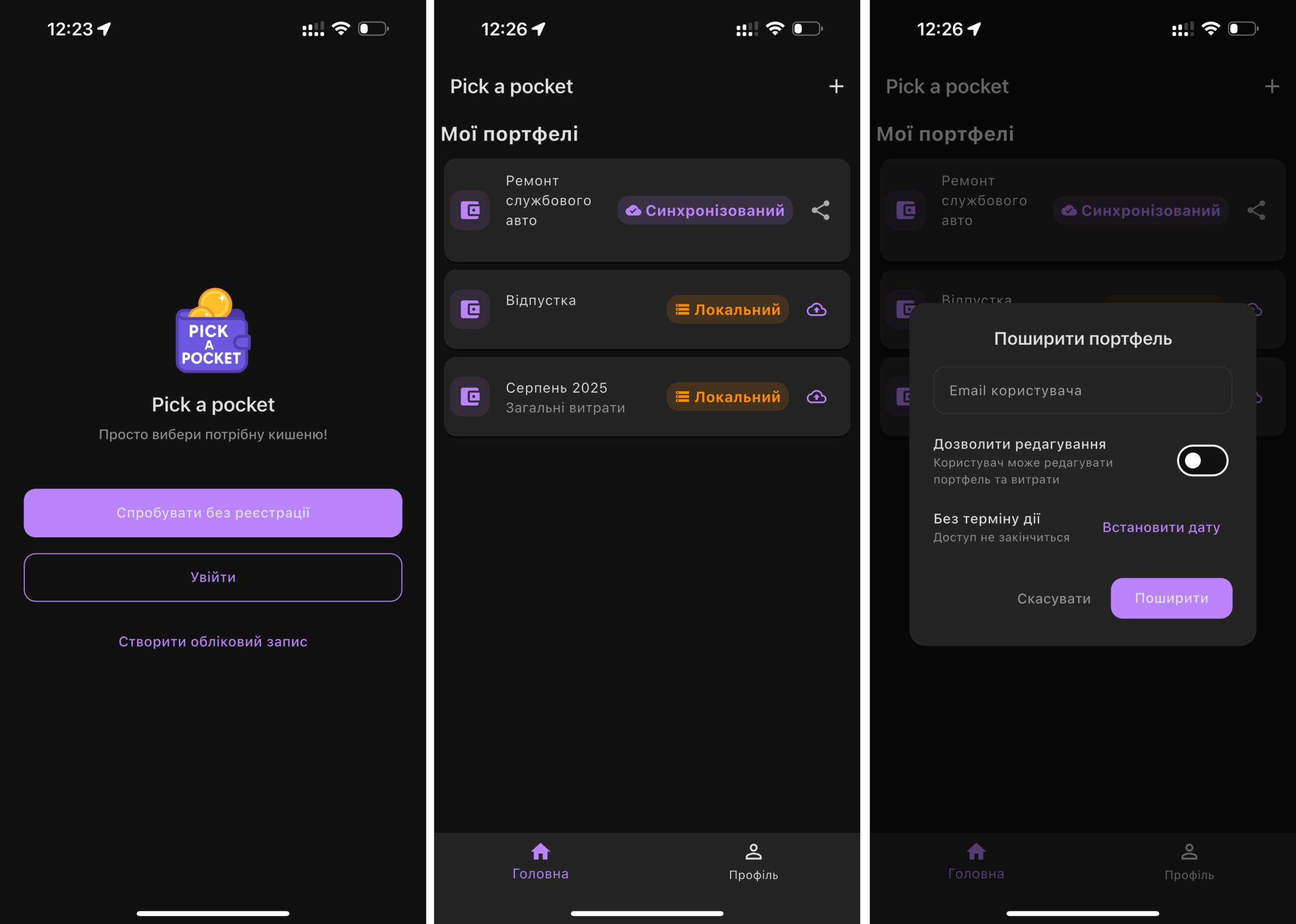 Перша мінімальна версія Pickapocket дозволяла додавати витрати вручну й одразу бачити загальну картину витрат. Для Олексія особливо важливою була функція спільних портфелів, адже він хотів вести бюджет разом з дружиною: