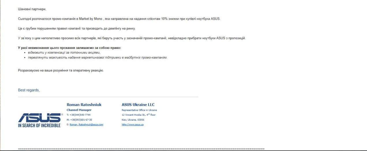 До свого повідомлення він також прикріпив лист від компанії Asus, де остання вказує, що подібна акція «призводить до демпінгу ринку».