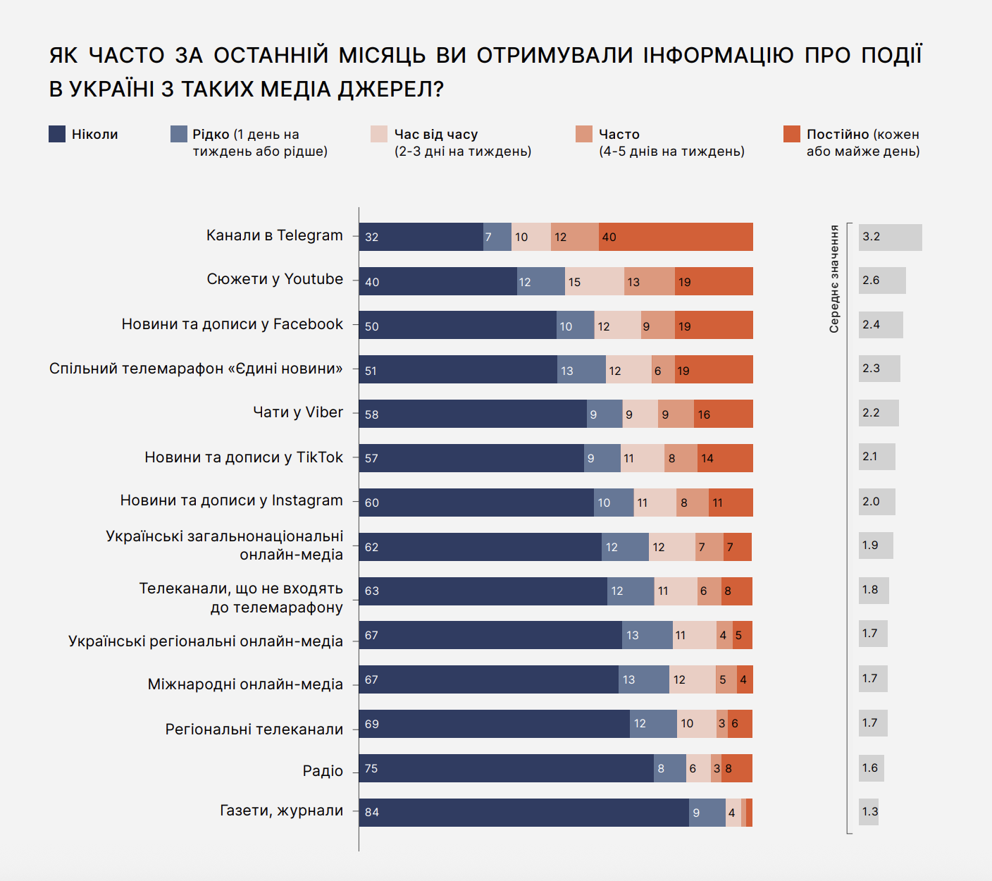- Більшість українців також ніколи не отримує інформацію з радіо (75%), регіональних медіа (69%), регіональних онлайн-медіа (67%), міжнародних онлайн-медіа (66%).