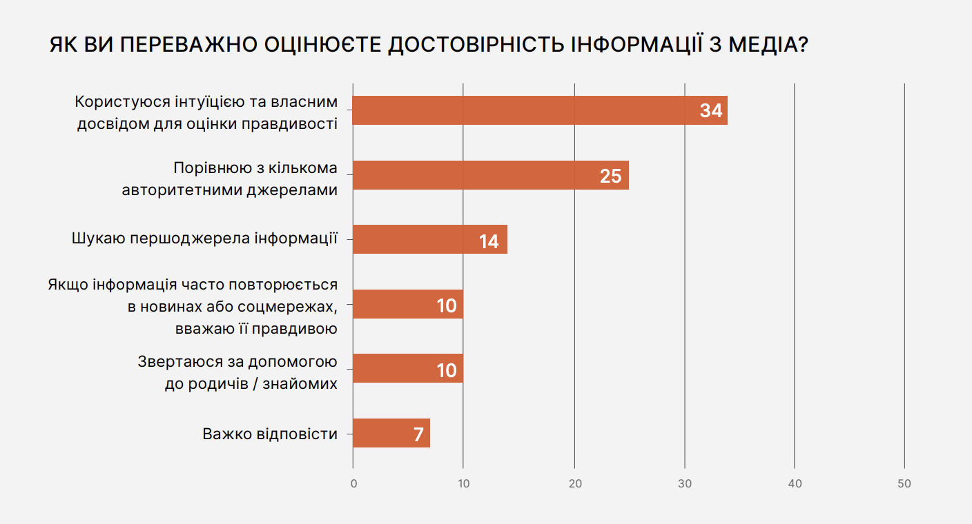 - Найпоширеніші практики перевірки правдивості – використання власної інтуїції та досвіду (34%) і порівняння з кількома авторитетними джерелами (25%).