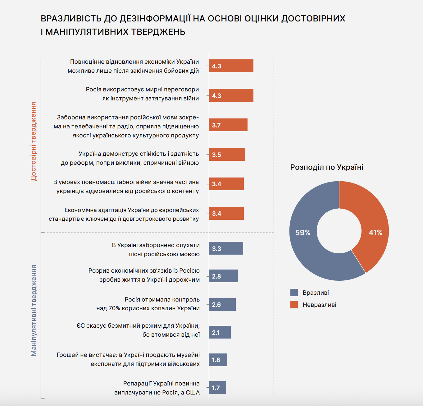 Одним зі завдань дослідження було виокремлення аудиторії, яка є вразливою до наративів дезінформації. Для визначення цієї групи та побудови її портрету дослідники сформулювали 12 тверджень на основі дискурсів і наративів, поширених в українських медіа, що стосуються різних тематик: політики і міжнародних відносин, економіки і культури. З кожної тематики в інструментарії представлені чотири твердження, два з яких є дезінформацією, два — правдивою інформацією (всього 16 тверджень). Респонденти мали визначити, чи є кожне з наведених тверджень дезінформацією або правдивою інформацією, за шкалою від 1 до 5, де 1 — цілковита маніпуляція,
