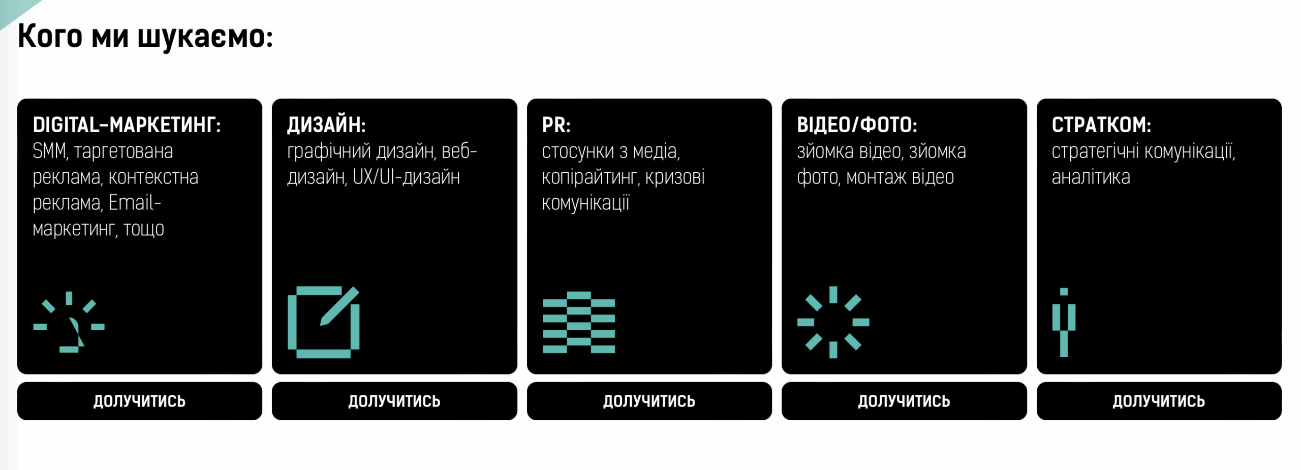 Ідея платформи полягає в тому, що кожен підрозділ потребує різних спеціалістів, один з напрямків — це комунікації. Поняття максимально широке, тому й завдання можуть різними: SMM, PR, стратегічні комунікації, копірайтинг, відео/дизайн/моушн, аналітика, UX/UI, фронтенд-розробка тощо.
