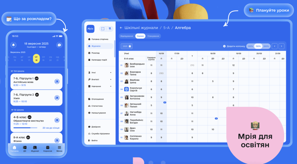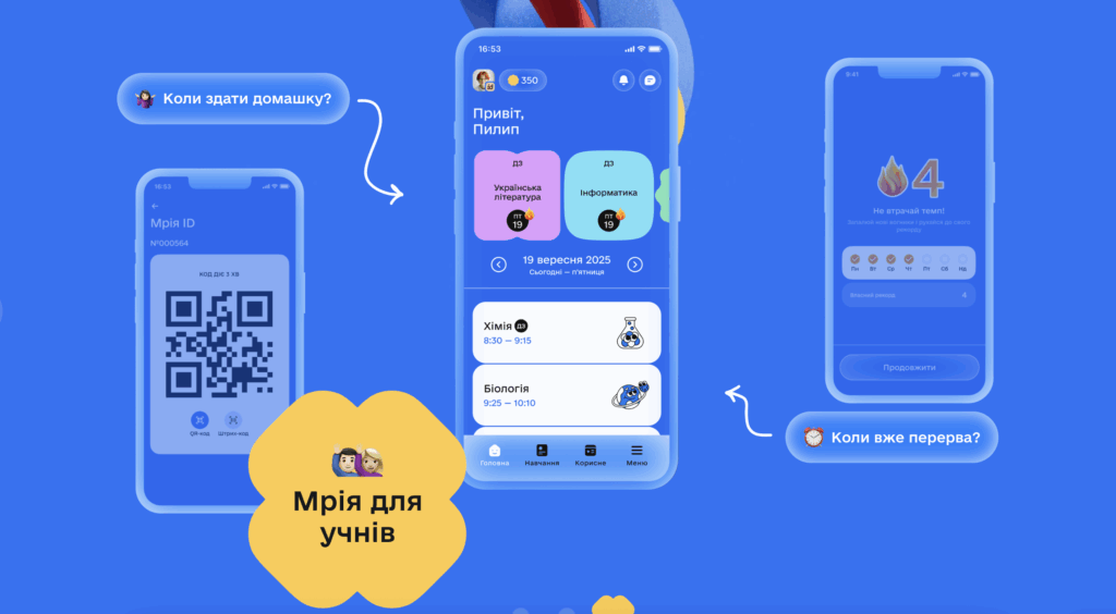 - «Мрія» об’єднує в собі цифрові посвідчення для учнів, розклад занять, освітній контент та безпечні комунікації в одному застосунку, допомагаючи вчителям заощаджувати десятки годин на рутинних завданнях, дітям — реалізовувати свій потенціал, а батькам — бути більш залученими до життя і розвитку їхніх дітей.