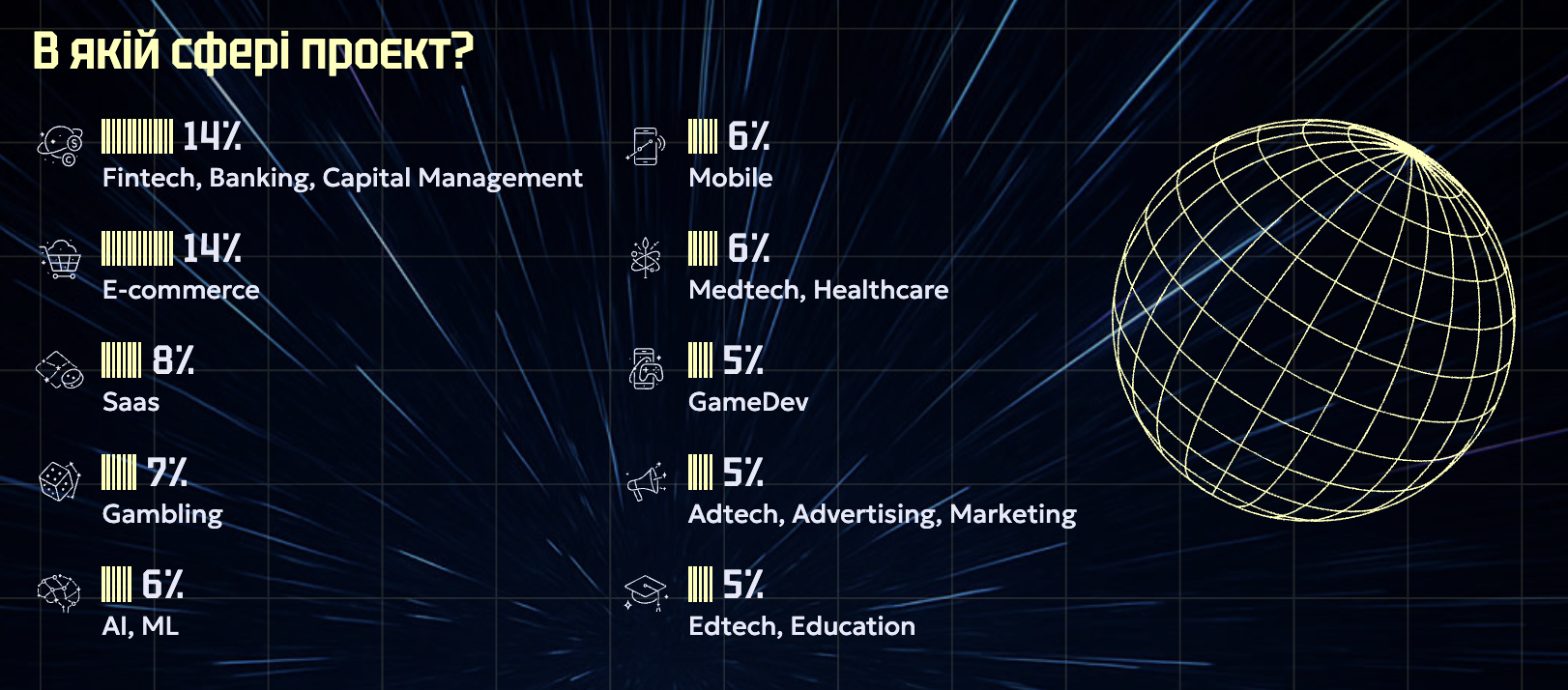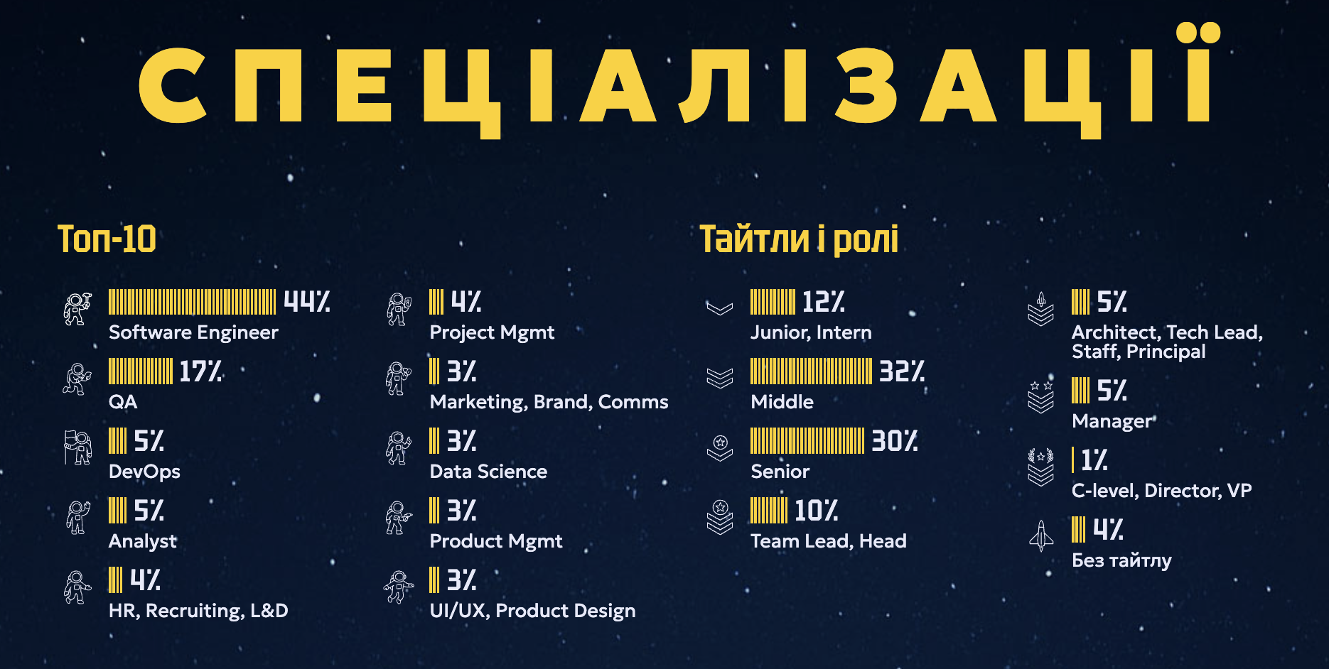- 88% айтівців працюють за технічними напрямами. Найбільшою спільнотою залишаються розробники — їх 44%. На другому місці тестувальники — 17%. Частка нетехнічних фахівців зростає – цього року вони становлять 12% усіх, хто працює в ІТ, проти 10% торік.