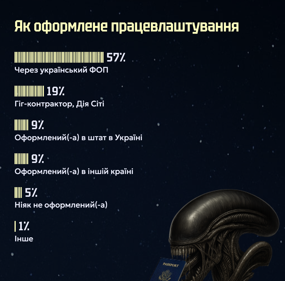 - Зараз 57% айтівців працюють як ФОПи, у 2024 році таких було 70%, а 2022-го — 87%. Натомість компанії частіше використовують оформлення через «Дія.City» (19% проти 12% торік).