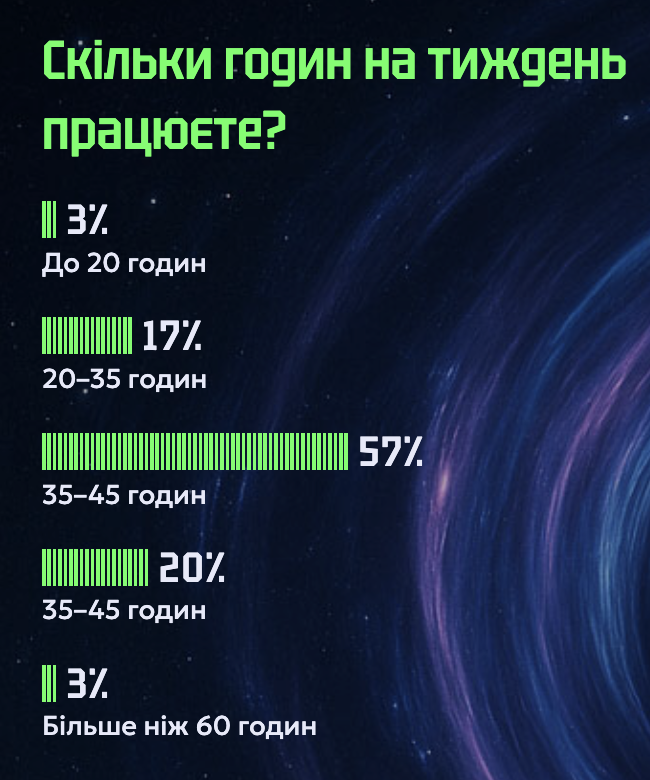 - QA, аналітики, HR, рекрутери та фахівці з брендингу, комунікацій частіше за інших встигають виконати всі робочі завдання за 45 чи менше годин на тиждень. Частіше за інших перепрацьовують DevOps, менеджери продукту, юристи та фахівці з Customer Success.