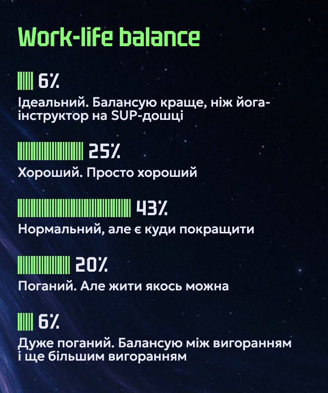 - Через збільшення часу на роботу в айтівців стає менше часу на інші заняття. Частка фахівців, які присвячують час пет-проєктам, знизилась з 13% до 11%.