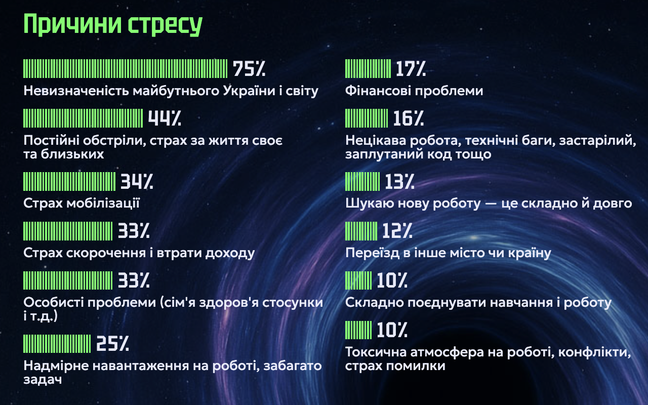 - Рівень стресу в айтівців в Україні та за кордоном майже однаковий: 6,4 та 5,9 бала з 10. Проте причини різні. І в Україні, і за кордоном основна причина стресу — невизначеність майбутнього (назвали понад 70%). На другому місці в Україні — обстріли (52%), а за кордоном — стрес від переїзду (51%). Чоловіки в Україні також згадують страх мобілізації (53%). Інші причини: страх скорочення чи втрати доходу, особисті проблеми, надмірне навантаження на роботі, фінансові негаразди, труднощі в пошуку нової роботи — однаково часто називали і в Україні, і за кордоном.