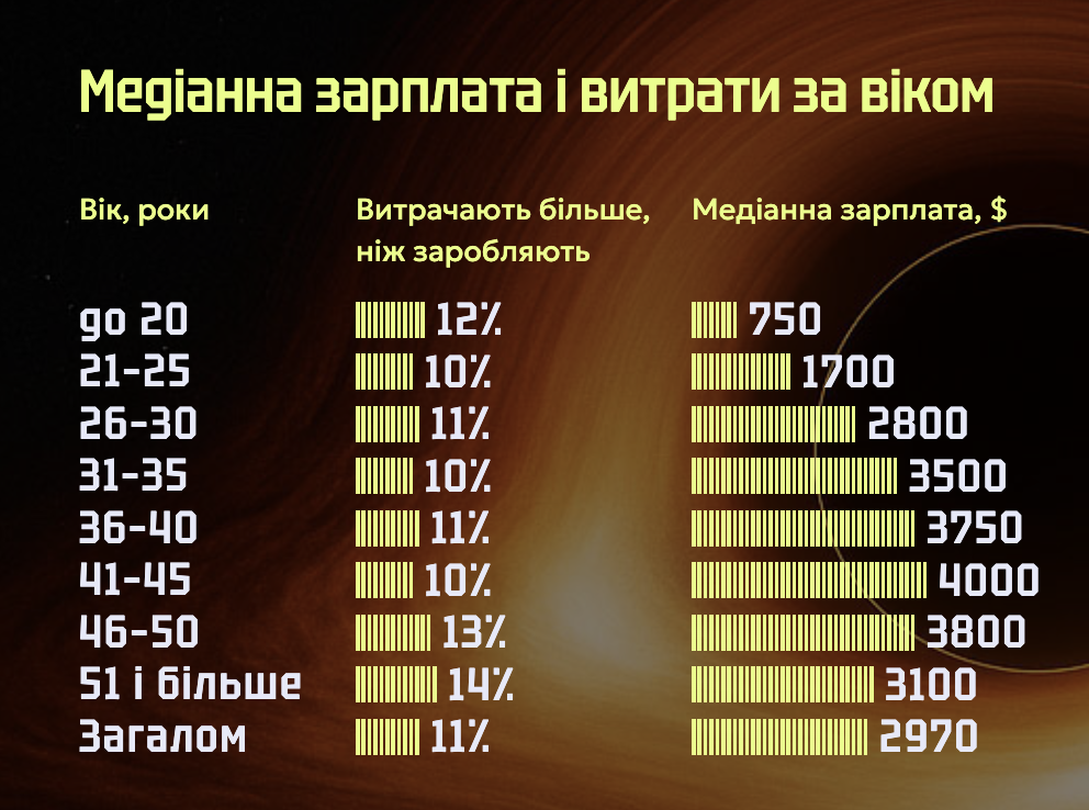 - Медіанна зарплата в ІТ цього року становить $3000 проти $2900 торік. Найвищі медіанні зарплати в айтівців віком від 43 до 50 років (близько $4500). Хоча падіння зарплат в ІТ і не спостерігається, зростає частка фахівців, які витрачають більше, ніж заробляють: 11% цього року проти 9% торік.