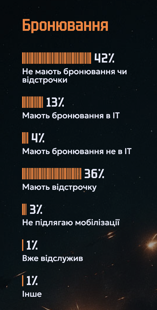 - Бронювання мають 17% айтівців-чоловіків. 13% (близько 22 000) заброньовані через ІТ-компанії, а ще 4% (близько 7000) — на іншій/додатковій роботі не в ІТ. Ще 36% мають відстрочку через вік, навчання, сімейні обставини тощо, а 3% не підлягають мобілізації і військовій службі.