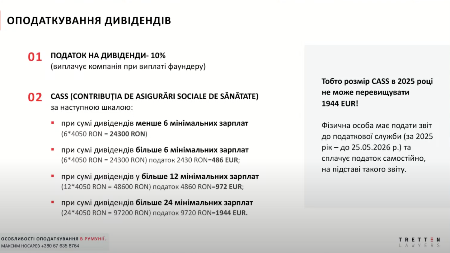 Якщо ж виводити дивіденди напряму з румунської юрособи, буде застосовуватися пласка ставка податку – 16% (до 1 серпня 2025 року вона становила 10%) + CASS (так званий податок на охорону здоровʼя), розмір якого залежить від суми виплачуваних дивідендів, але не більше €1944. Тобто, незалежно від того, скільки ви виводите – €100 000 чи €5 млн – цей податок складатиме €1944.