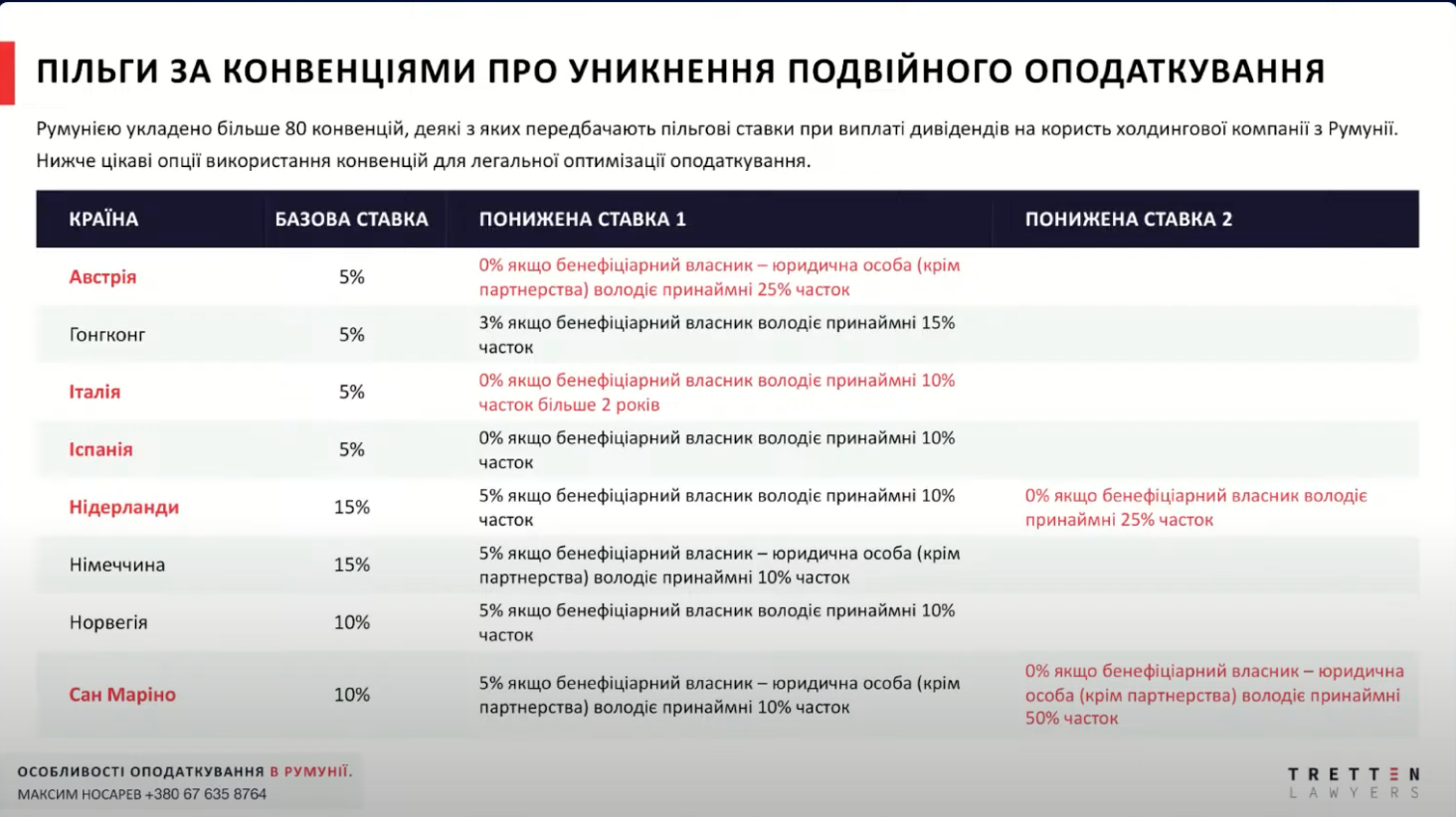Наразі в Румунії підписано понад 80 конвенцій з уникнення подвійного оподаткування. Ми вивчили їх всі, і зʼясувалося, що з деякими країнами податок на дивіденди фактично можна обнулити за певних умов (залежно від частки та строку володіння). Серед них Австрія, Італія, Іспанія, Нідерланди та Сан Маріно.