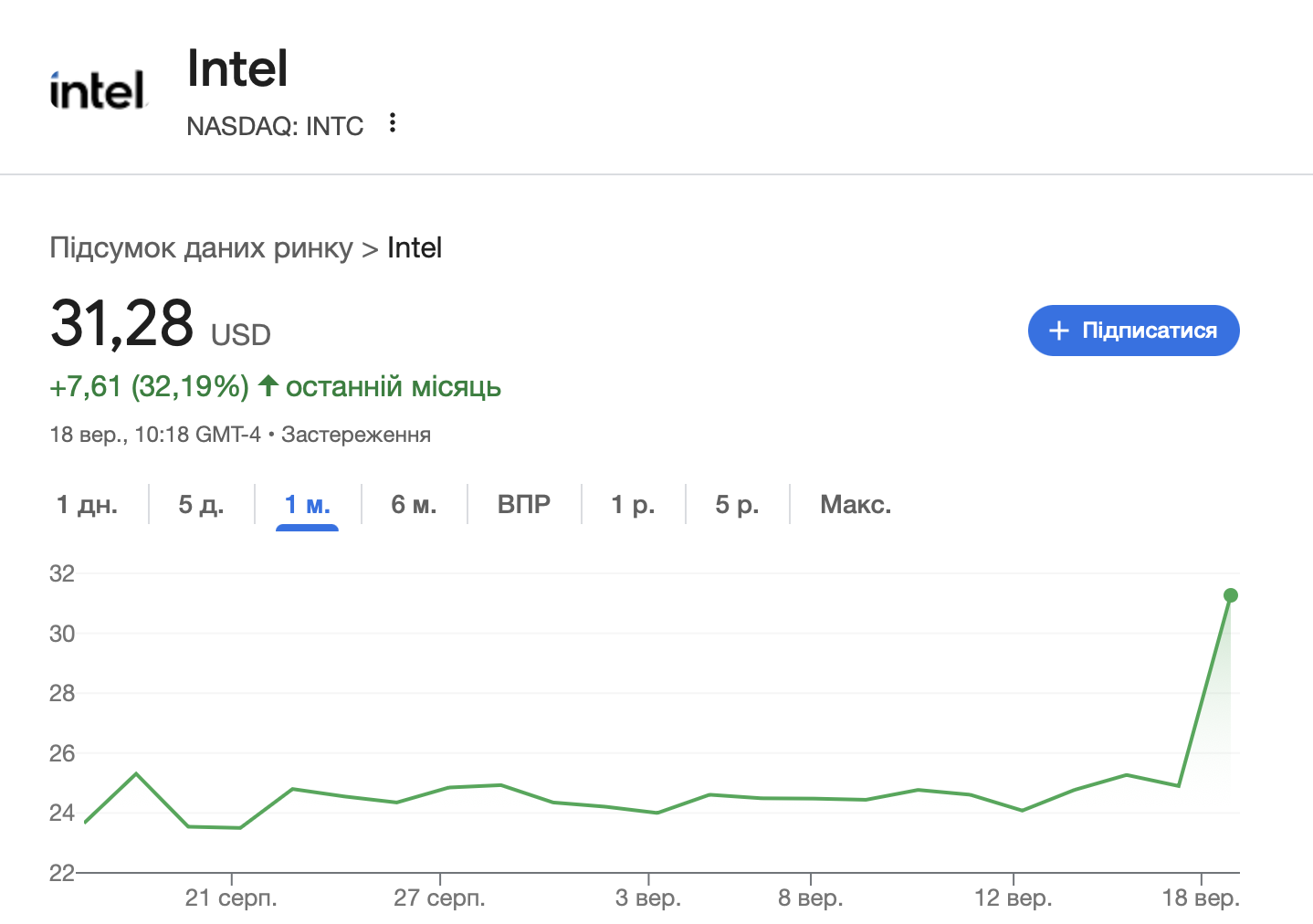 Nvidia погодилася інвестувати $5 млрд в Intel і заявила, що компанії спільно розроблятимуть чипи для ПК та дата-центрів. Це несподіваний крок, який буквально спричинив вибух на ринку: акції Intel виросли з приблизно $23 за штуку до $32 в моменті. Якщо ви інвестор Intel — це той день, якого ви давно чекали.