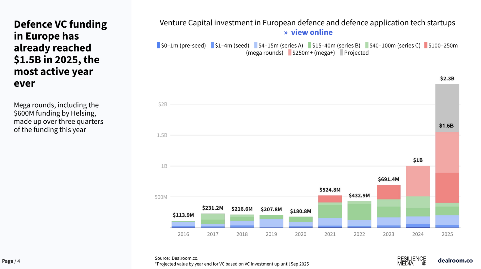 Венчурні інвестиції в оборонний сектор у Європі зросли до $1,5 млрд лише за 2025 рік. Це у 4 рази більше, ніж до 2020 року. Але попри це зростання, деякі напрями безпеки залишаються недофінансованими. Про це йдеться у новому дослідженні The State of Defence Tech 2025 від Dealroom, яке представили 29 вересня в Лондоні на Resilience Conference 2025.