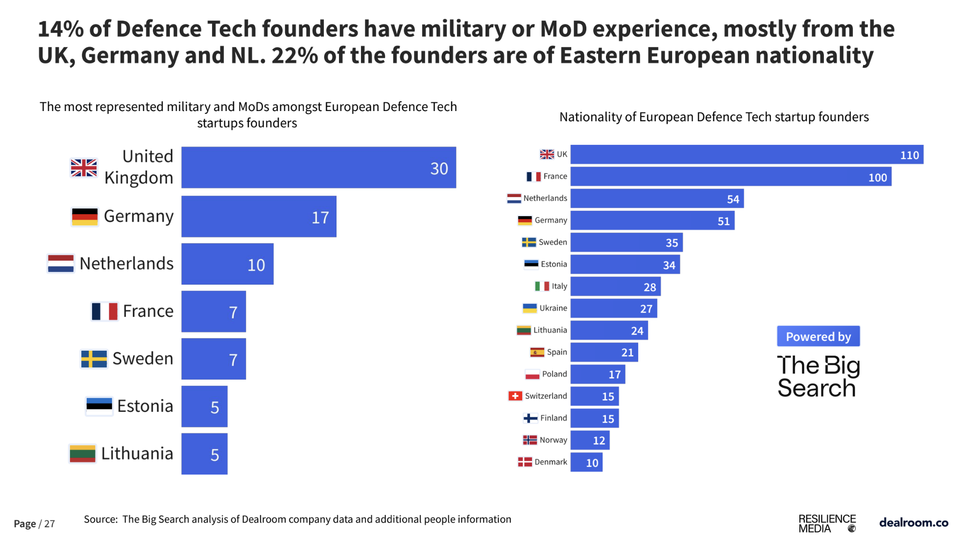 - Сьогодні 14% засновників оборонних стартапів у Європі мають досвід служби в армії або роботи у міністерствах оборони. Більшість із них — з Великої Британії, Німеччини та Нідерландів.