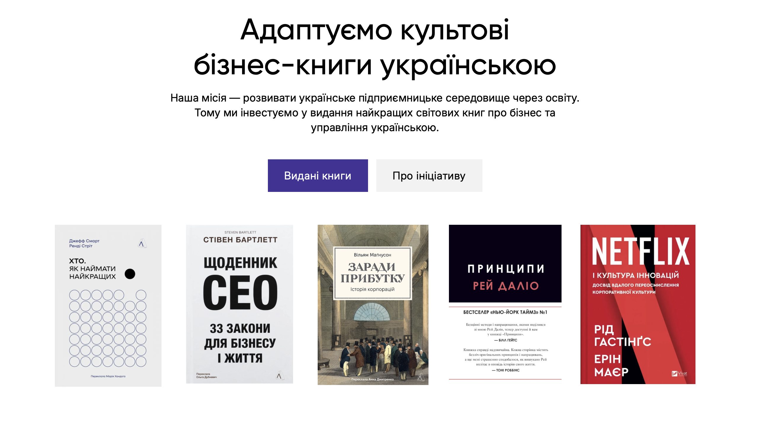 - Наразі в портфелі 5 книжок: «Хто. Як наймати найкращих», «Щоденник СЕО», «Заради прибутку. Історія корпорацій», «Принципи», «Netflix і культура інновацій».