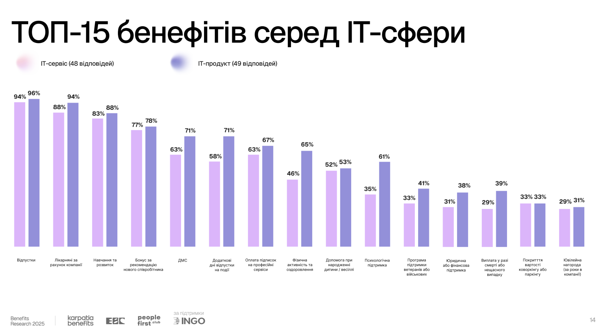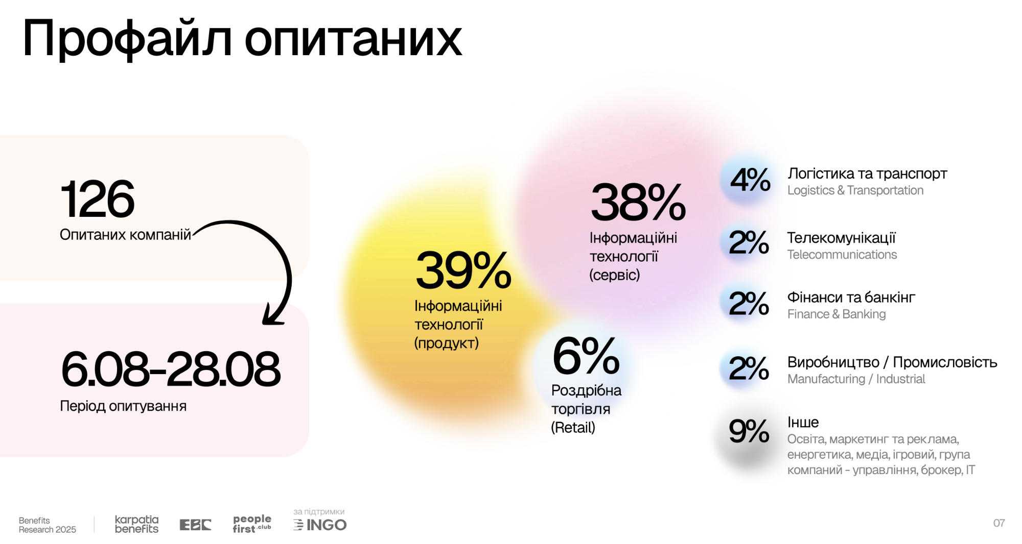 Такі результати дослідження Benefits Research 2025, яке провела компанія Karpathia разом з партнерами. Висновки базуються на результатах опитування 126 компаній від 10 до 10 000 людей, проведеного у серпні 2025 року. Серед них найбільша вибірка саме ІТ-компаній – на них припадає майже 80% респондентів.