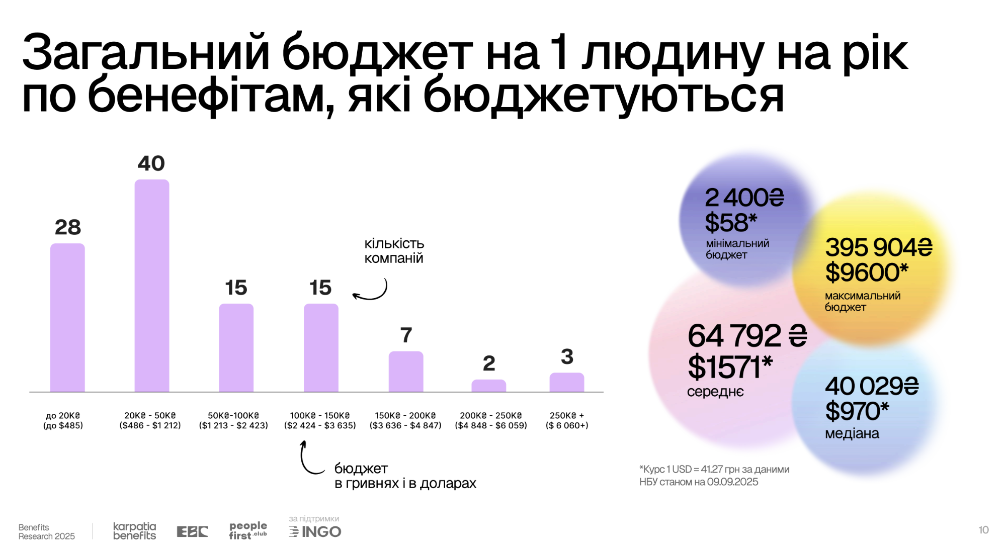 - Переважно компанії витрачають на бенефіти від 20 000 до 50 000 грн на людину за рік.