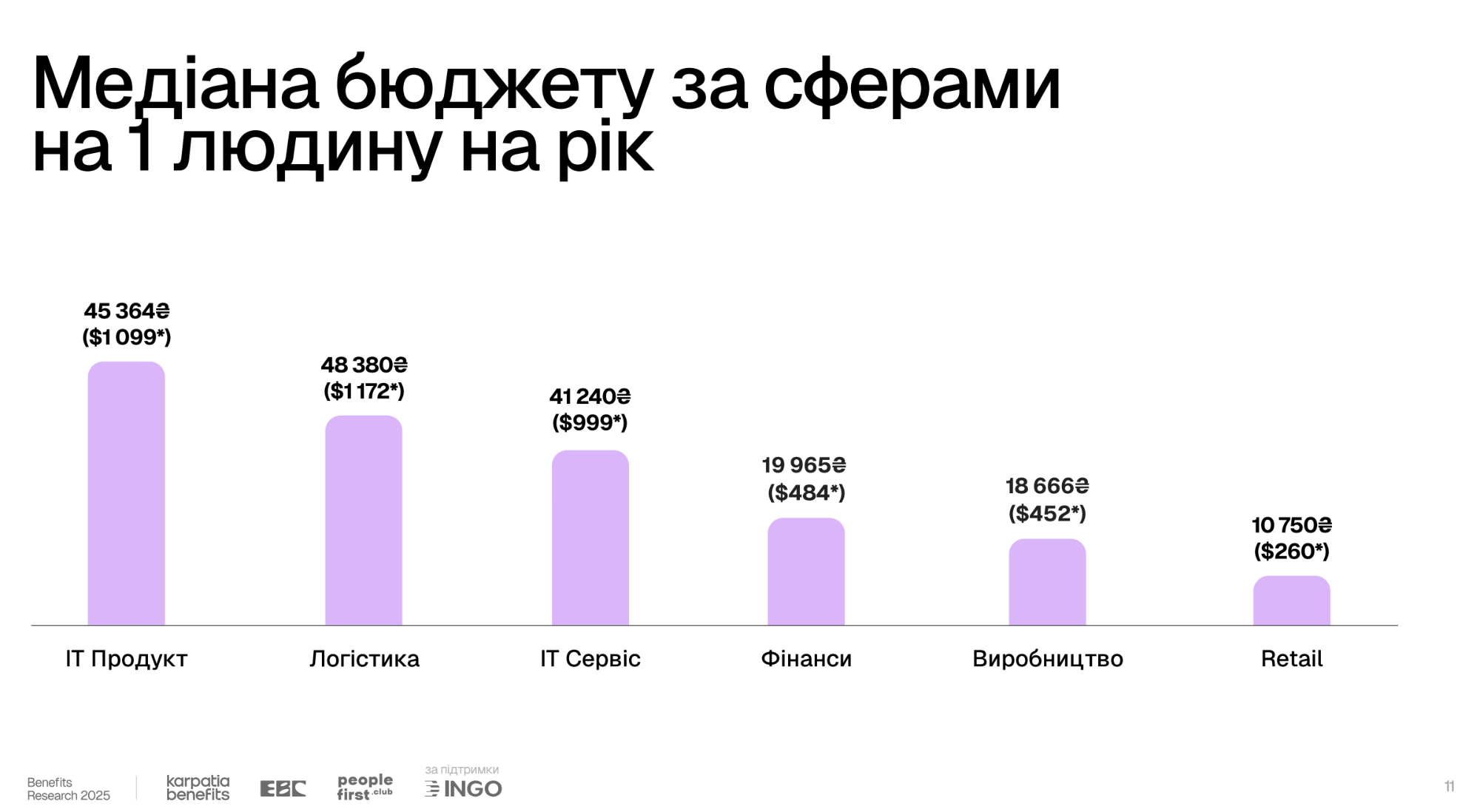 - Найбільші бюджети на бенефіти у продуктових ІТ-компаній, в логістиці та сервісному ІТ – понад 40 000 грн на рік на людину.