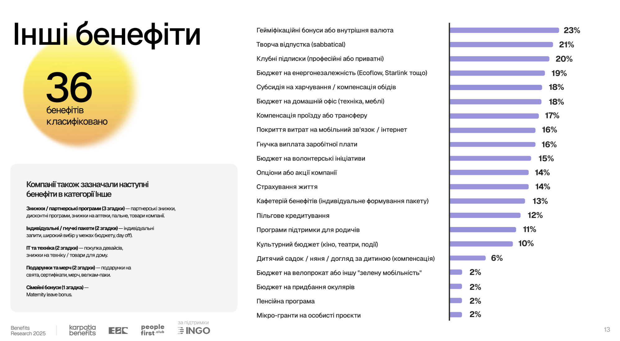 - 2% респондентів згадали такі досить екзотичні бенефіти, як пенсійна програма, бюджет на окуляри, гроші на «зелену мобільність» та мікрогранти на особисті проєкти.