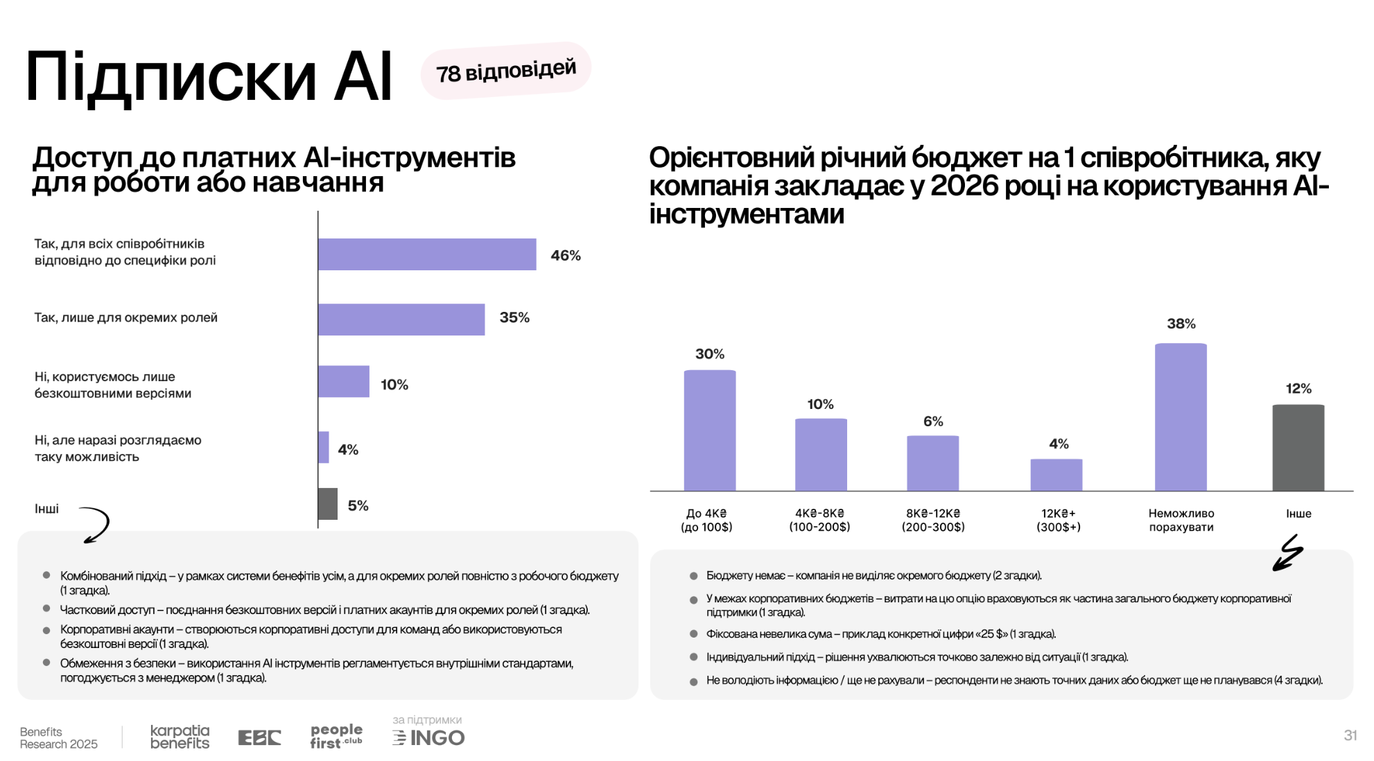 - 46% респондентів оплачують співробітникам необхідні для роботи ШІ-інструменти. 10% взагалі не платить за ШІ, співробітників просять користуватися лише безкоштовними версіями потрібних продуктів.