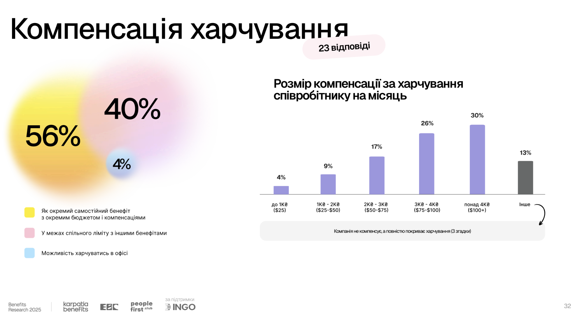 - Так чи інакше компенсують харчування своїм співробітникам лише 23 зі 126 компаній-респондентів. Наразі популярна в США «плюшка» не прижилась в Україні.