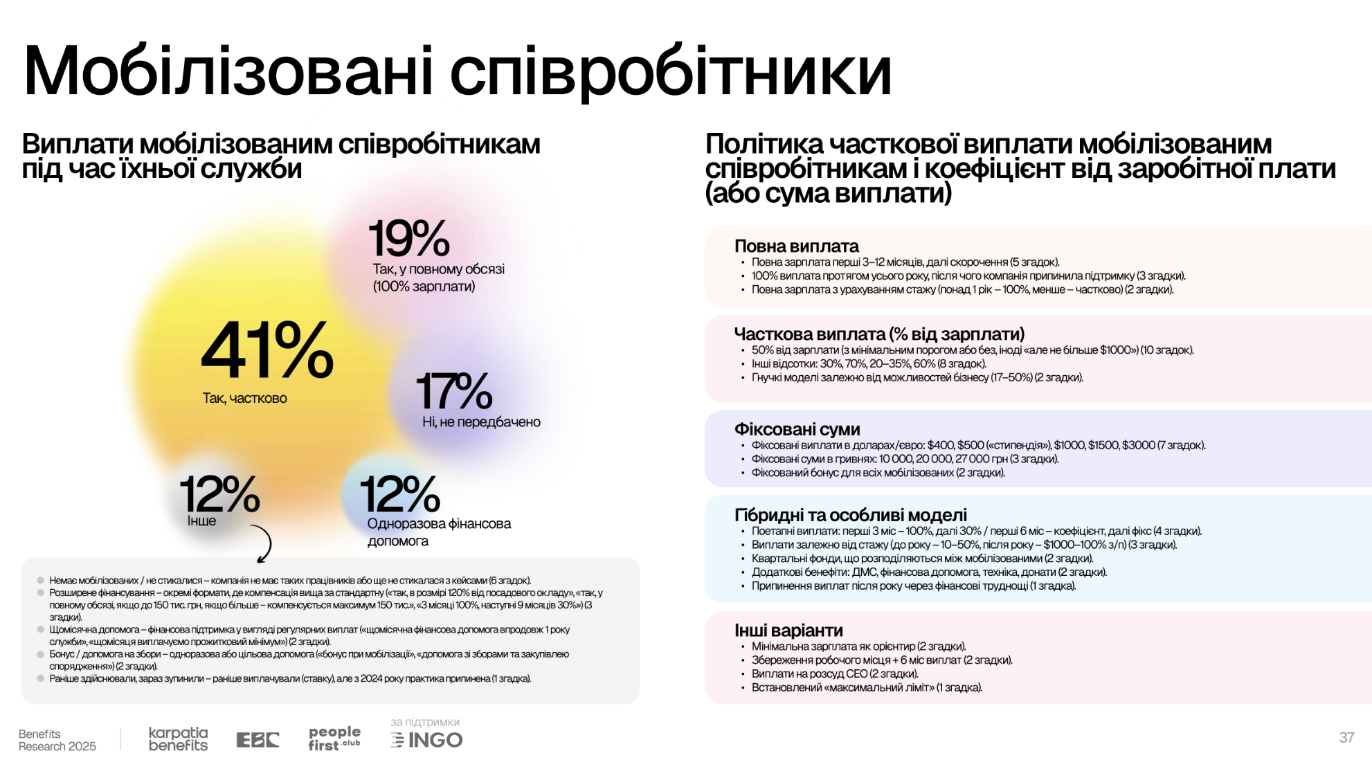 - Більшість, а саме 41% компаній, виплачують частину зарплатні мобілізованим колегам.