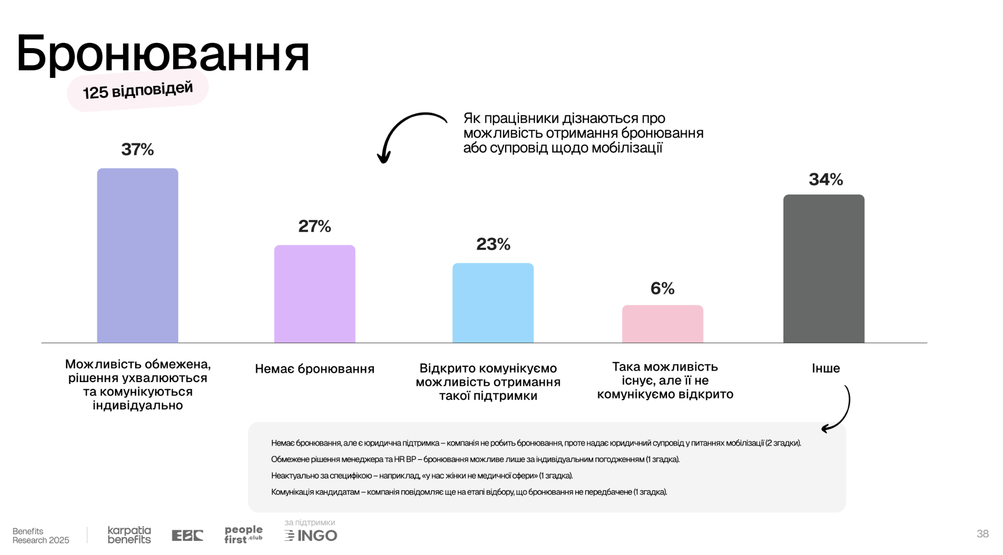 - З бронюванням співробітників все складно, відкрито комунікують таку можливість лише 23% зі 125 респондентів.