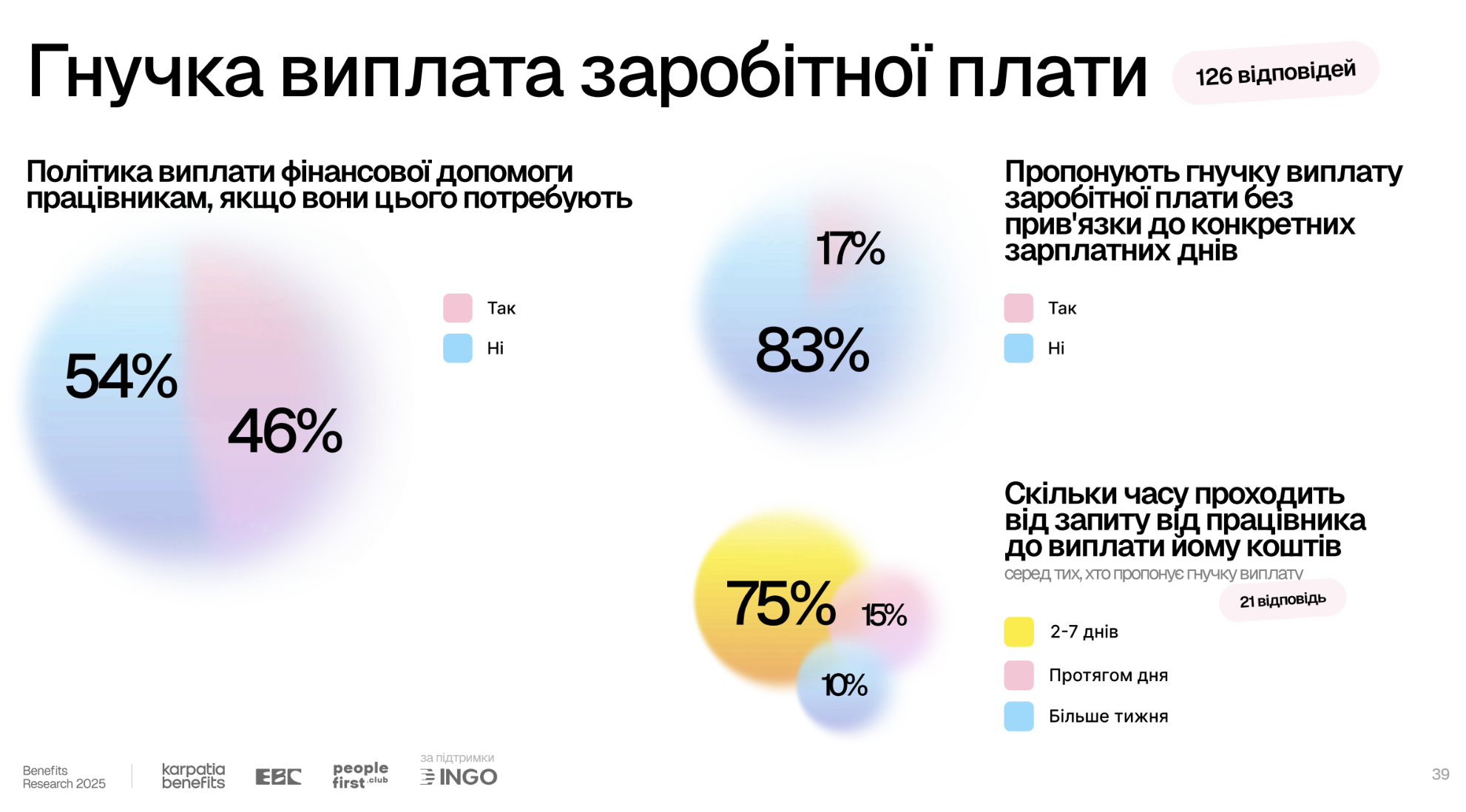 - 46% респондентів пропонують своїм співробітникам гнучку виплату зарплатні. Але лише 17% – без привʼязки до якихось конкретних термінів.