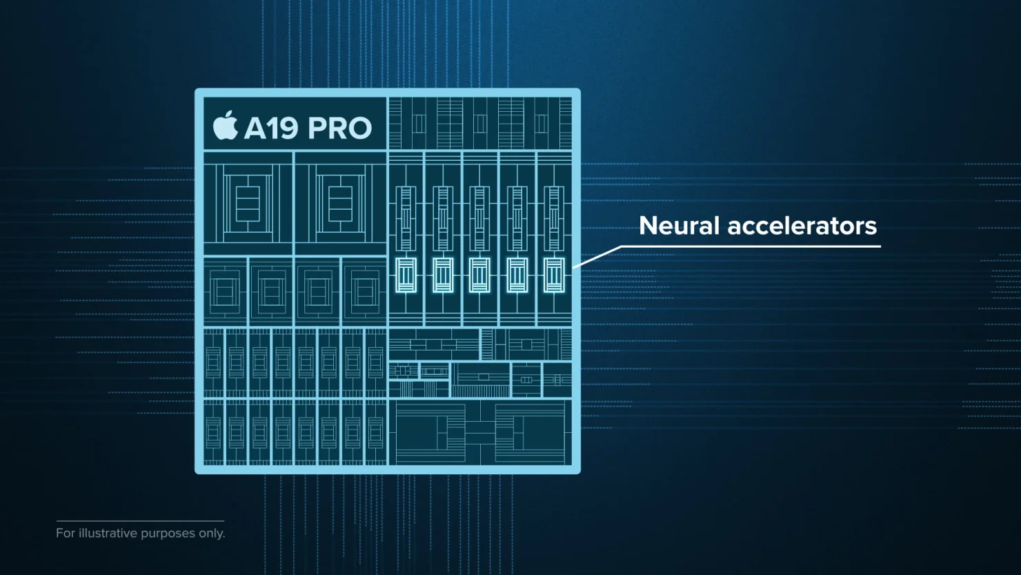 • Компанія представила чип A19 Pro — власну розробку з радикально зміненою архітектурою, де до кожного графічного ядра (GPU) додано нейронні акселератори, що значно підвищують обчислювальну потужність для AI-завдань.