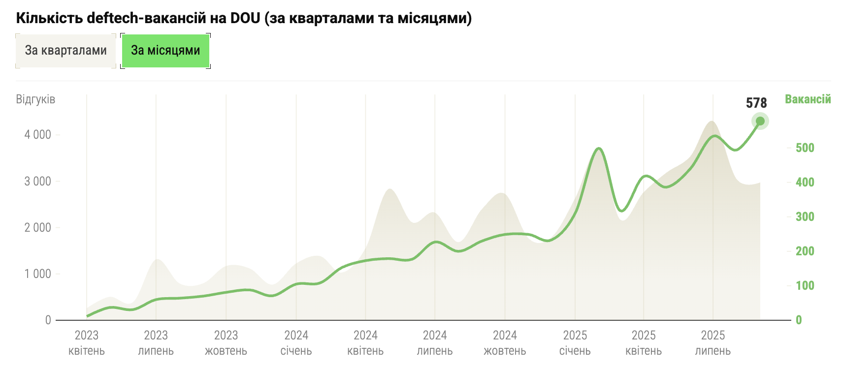 • У ІІ кварталі 2023 року на DOU було 79 deftech-вакансій, а вже наступного їх стало 194 (на 59,3%) більше. У 2024 році кількість вакансій зростала щоквартально: 366 вакансій в І кварталі, 529 — у ІІ, 657 — у ІІІ та 731 — у IV кварталі.