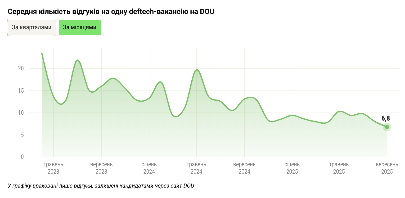 • Якщо кількість вакансій зростала, то кількість відгуків на них пропорційно знижувалася щоквартально та щомісячно. Якщо у 2023 році на вакансію припадало в середньому 15-18 відгуків, то у 2025 році — лише 8-9.