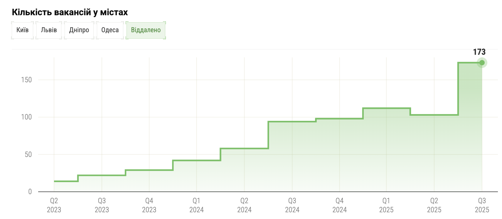 • Віддалених пропозицій трохи більше — 173. Водночас ремоут-вакансії суттєво поступаються офісним, що теж відрізняє deftech-роботодавців від решти на IT-ринку.