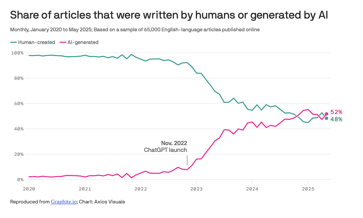 Видання Axios отримало статистику від дослідницької компанії Graphite, згідно з якою приблизно половину нових текстів в інтернеті вже створює штучний інтелект.