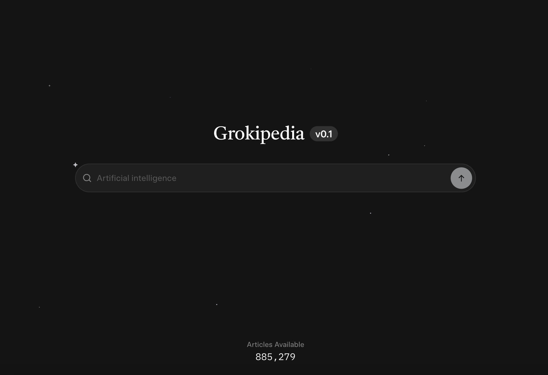 • Інтерфейс Grokipedia нагадує Wikipedia: темний фон, поле пошуку та шрифт у стилі Wikipedia і ChatGPT. На головній сторінці зазначено, що Grokipedia перебуває у версії v0.1 і містить 885 279 статей. Для порівняння, Wikipedia повідомляє, що англомовна версія має понад 7+ млн статей.
