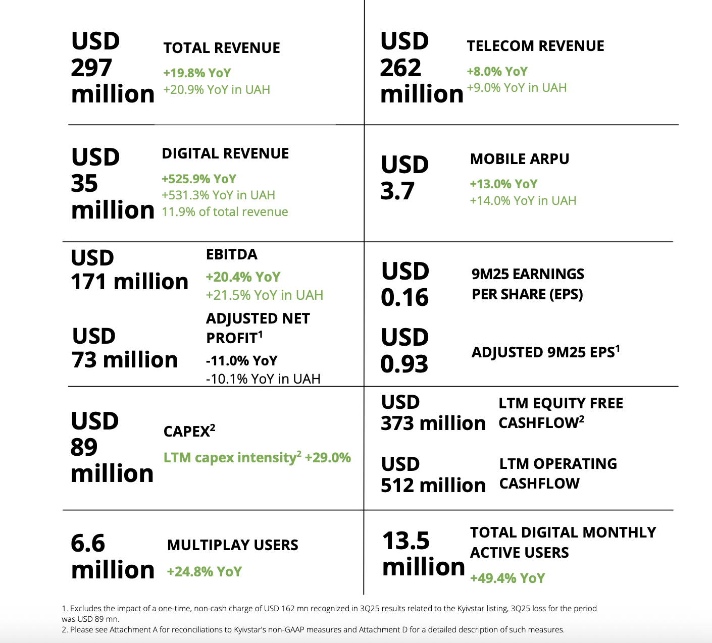 - Абонентська база на 30 вересня – 22,5 млн мобільних клієнтів та 1,2 млн фіксованого інтернету. ARPU мобільних послуг зріс до $3,7 (+13 %).